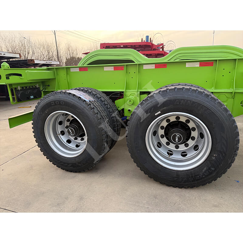 Fordonet är tillverkat av högkvalitativt stål, med en stabil och hållbar struktur. Den har en maximal effektiv nyttolast på 40 ton, lämplig för transport av 20/40-tonscontainrar. Karossstorleken är 14000x250x1800mm, utrustad med 2 Fuwa-märkta axlar och valfri mekanisk eller luftfjädring, vilket ger både körstabilitet och stötdämpande prestanda. Den är utrustad med däck med specifikationerna 12R22.5, 12.00R20 och 11R22.5, anpassade till olika vägförhållanden. Bladfjädern 90 mm (bredd) × 13 mm (tjocklek) × 10-lagers bladfjäder förbättrar lastkapaciteten ytterligare, och standardstödbenen på 28 ton garanterar parkeringssäkerheten.