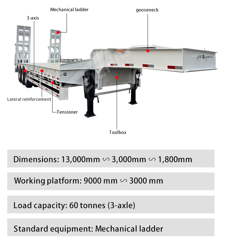 LUYI 3-axlade 60-tons lågbäddssemitrailer, som kommer från Shandong, Kina, är ett pålitligt val för tung utrustningstransport! Släpvagnen är konstruerad med höghållfast kolstål och är robust, hållbar och har utmärkt bärfö......