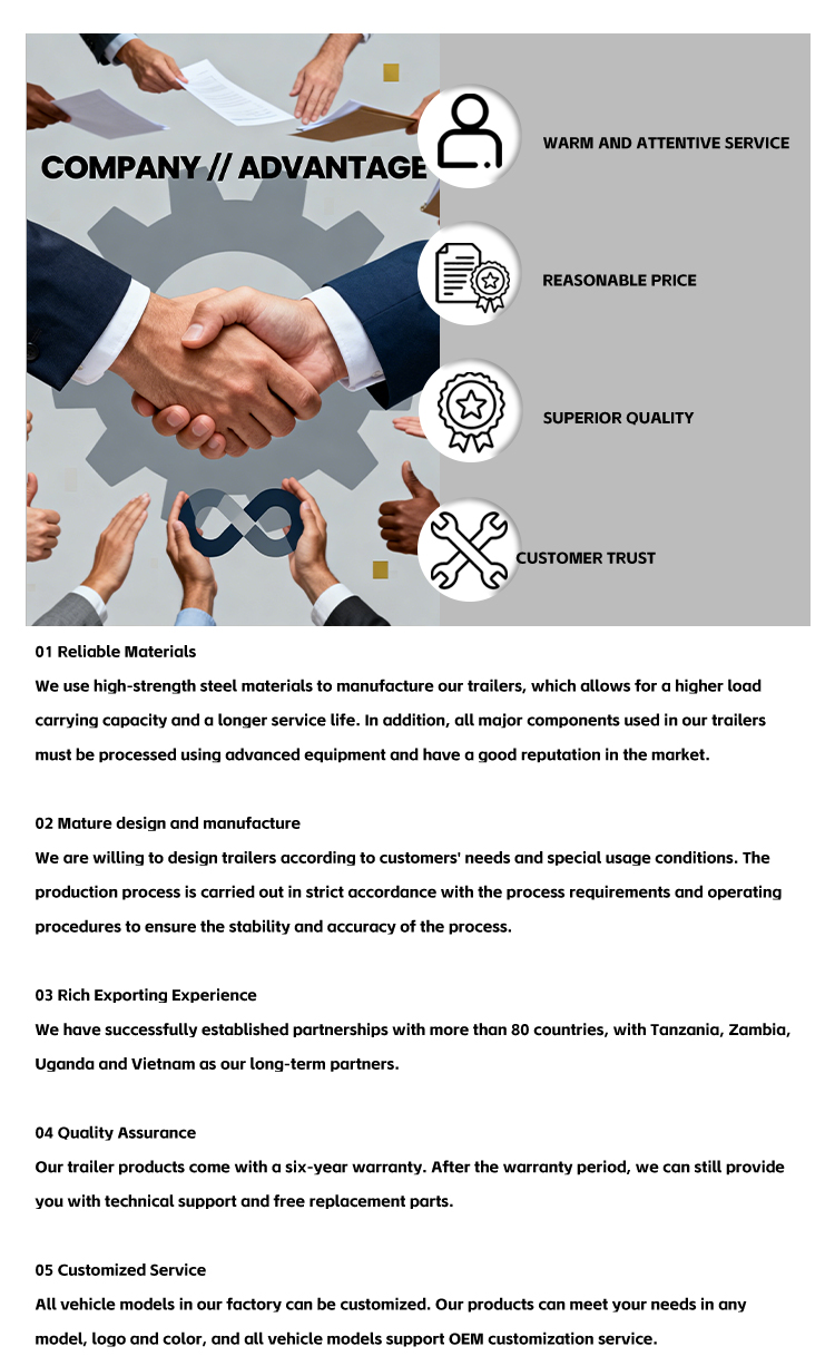 Kroppsfärgen är anpassningsbar för att möta olika användningsbehov och krav på varumärkesimage. Som en professionell påhängsvagnstillverkare följer LUYI strikt kvalitetskontroll och praktisk produktdesign, och tillhandahåller effektiva och säkra lösningar för alla typer av tunga transportscenarier. Det är en pålitlig partner för ditt utrikeshandelsföretag!