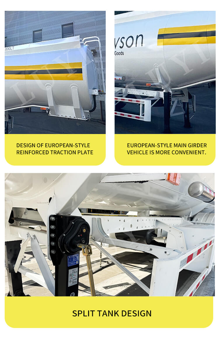 LUYI 3-axlig 3-tank 42 000 L dieselbränsletank Semi-Trailer, en helt ny professionell oljetransportutrustning, tillverkas i Shandong, Kina. Dess kropp är gjord av stål, med måtten 1065025003800mm. Designen med 3 tankar möjliggör klassificerad lastning av diesel, och den stora kapaciteten på 42 000 liter, i kombination med en maximal nyttolast på 5 001-10 000 kg, möter behoven för små till medelstora oljetransporter.