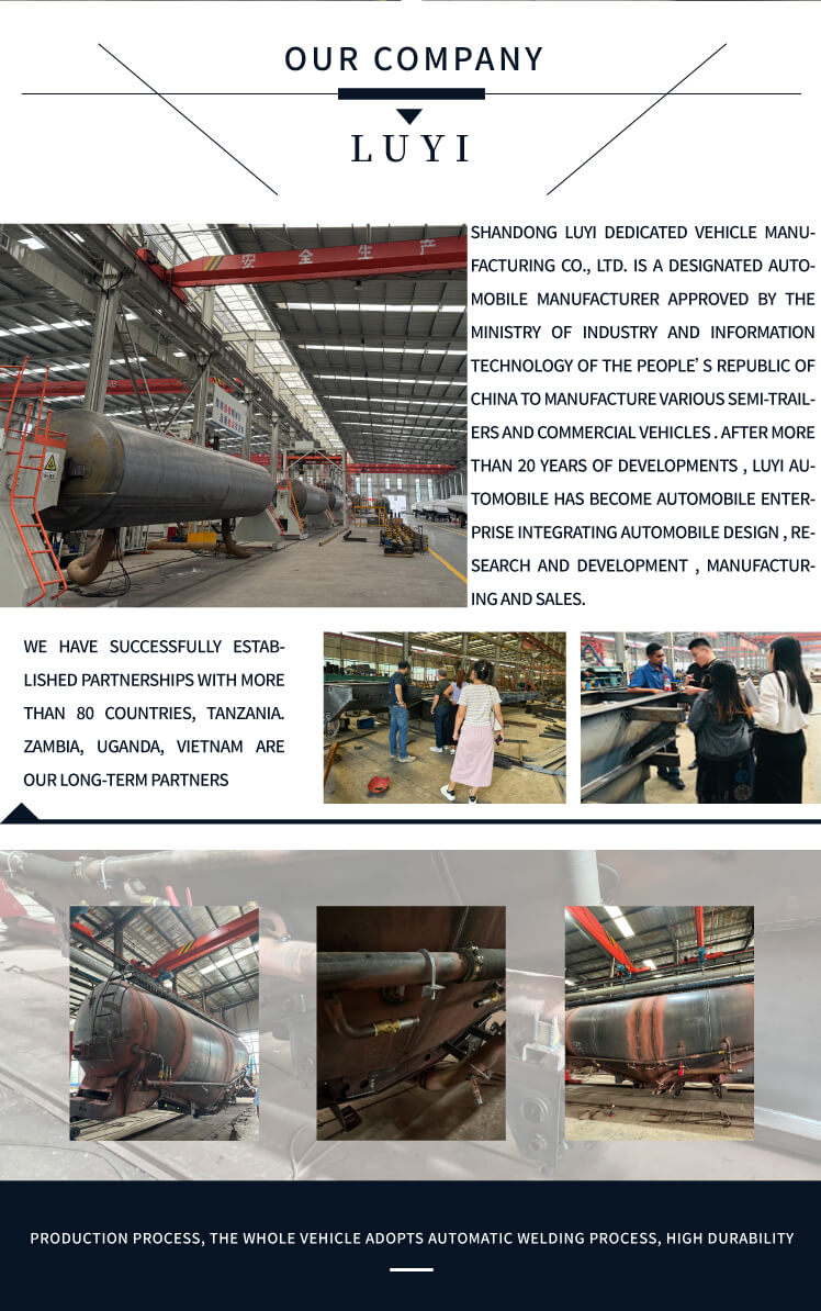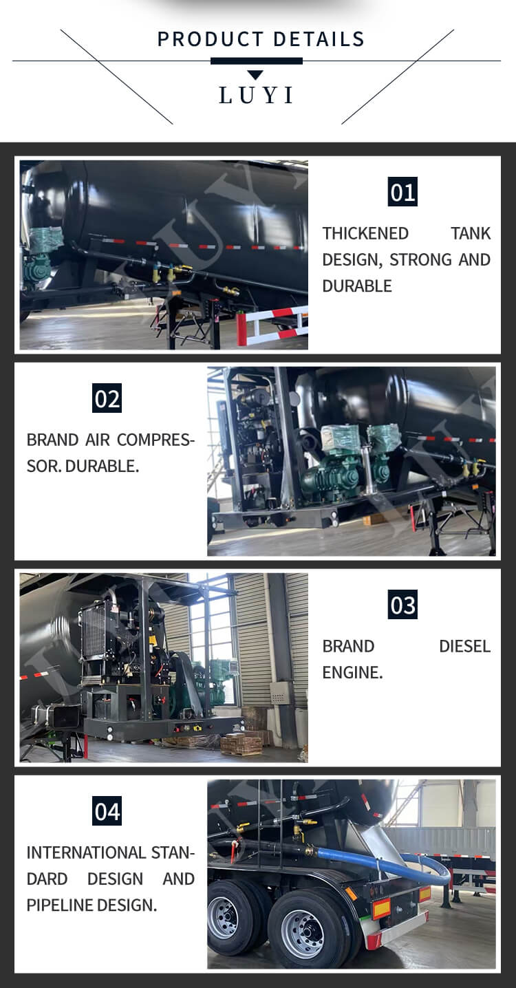 Luyi 3-axlade 35 kubikmeter cementtanksemi-trailer, som kommer från Shandongprovinsen, Kina, är en högkvalitativ semitrailer speciellt byggd för bulkcementtransport. Den har en lastkapacitet på 80 ton, en effektiv last som sträcker sig från 60 ton till 80 ton och en maximal effektiv last på 80 000 kg, vilket effektivt kan möta transportbehov av stora volymer.
