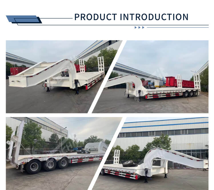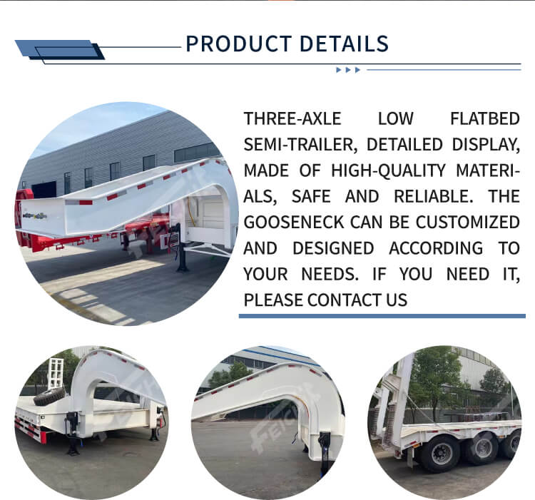Tillverkad av högkvalitativt stål, den har en storlek på 17000×3000×1500 mm, vilket säkerställer gott om utrymme för last. Den har 4 axlar för stark lastbärande, med valfri luft- eller bladfjädring för att garantera stabil körning och effektivt lastskydd. Den avtagbara svanhalsdesignen förbättrar lastningsflexibiliteten, medan hydrauliska eller manuella stegalternativ förenklar lastning och lossning av tung utrustning.
