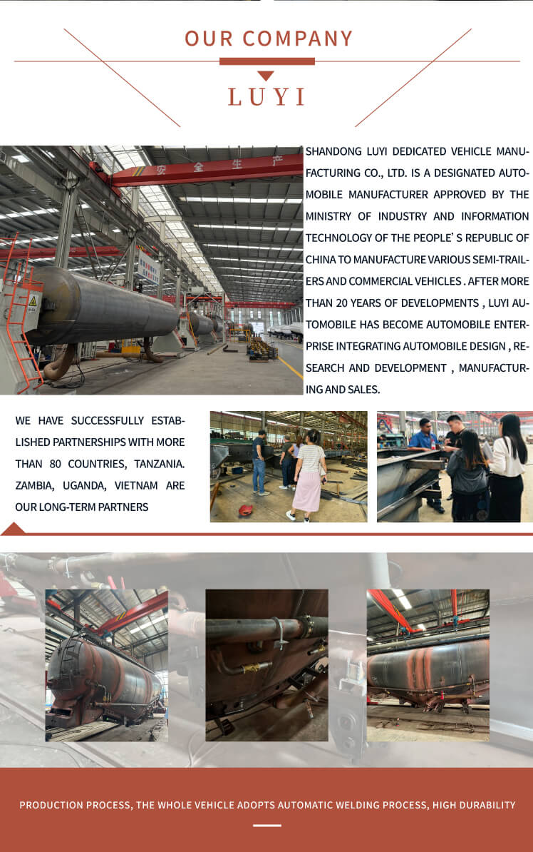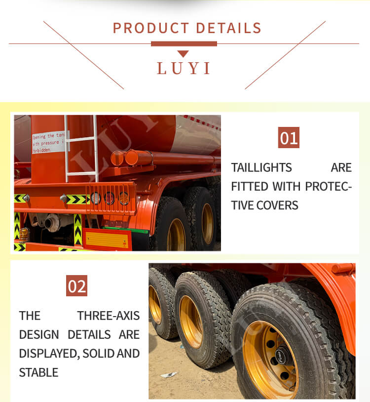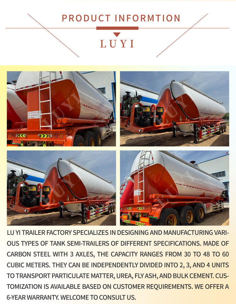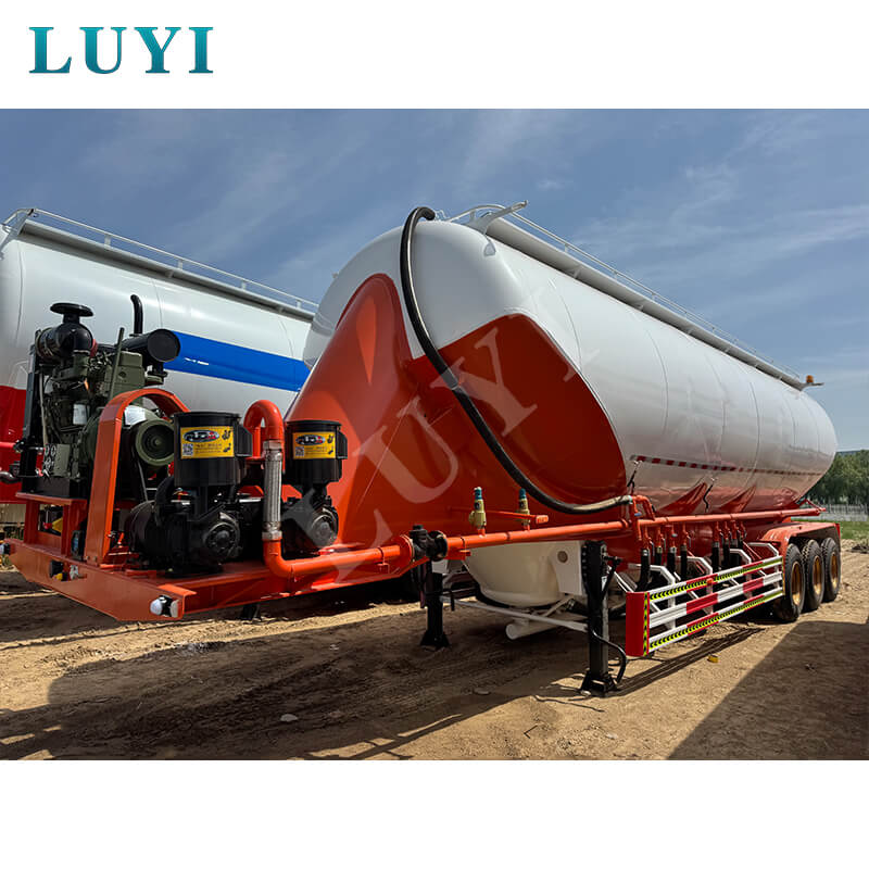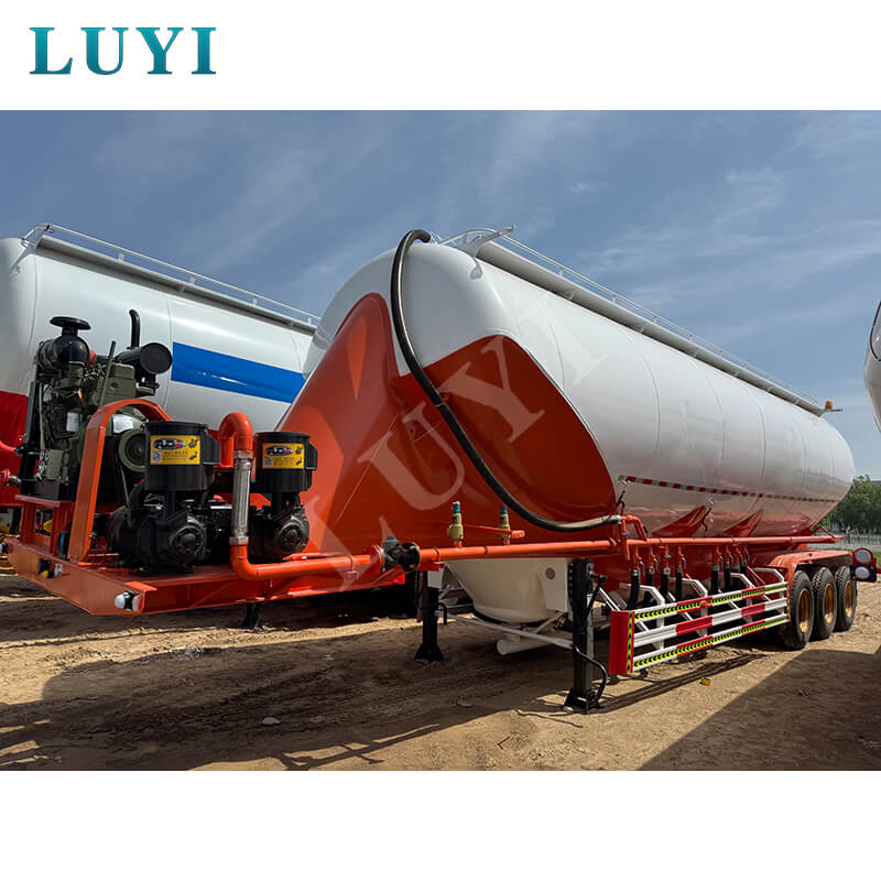 LUYI 3-axliga 50-tons V-Type Cement Tanker Semi-Trailer, som kommer från Shandong-provinsen, Kina, är en högeffektiv lastbilssemitrailer speciellt designad för bulkcementpulvertransport, även känd som en pulvertankbil, som exakt uppfyller behoven i scenarier för lasttransport.
