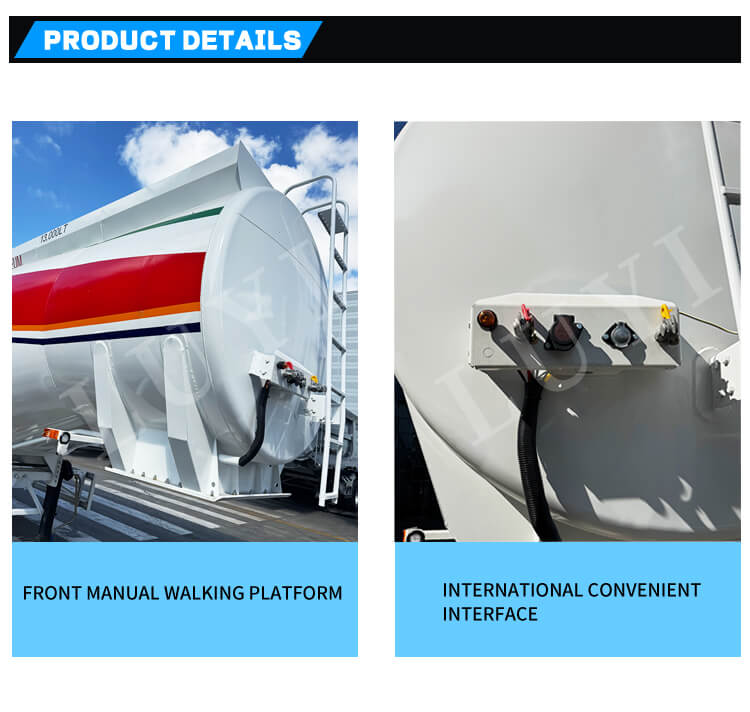 Trailern har solida och pålitliga konfigurationer. Den är utrustad med 13/16-tons axlar från märken som Fuwa, BPW eller BERKLEY, och erbjuder mekanisk eller luftfjädring som tillval. Den är kompatibel med olika däckspecifikationer inklusive 11.00r20, 12r22.5 och 315/385, vilket säkerställer stabil körning och anpassningsförmåga till olika vägförhållanden. Den levereras med standard 28-tons landningsställ och 50#/90# kungstift för bekväm och säker användning. Produkten stöder anpassade kroppsfärger, kombinerar praktisk och personlig anpassning för att tillhandahålla en stabil och effektiv professionell lösning för oljetransport.