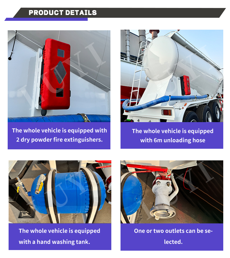 LUYI-märket 3-axlad 30-kubisk pulvertank semitrailer, som kommer från en högkvalitativ tillverkningsbas i Shandong, Kina, är skräddarsydd för transportscenarier för torr bulkmjöl. Hela fordonet är tillverkat av höghållfast kolstål, där helljuset använder Q345B/ST52-3 standardstål, som kombinerar hållbarhet och bärande stabilitet. Den vetenskapliga storleksdesignen på 12000mm * 2500mm * 3980mm är lämplig för olika transportscenarier.