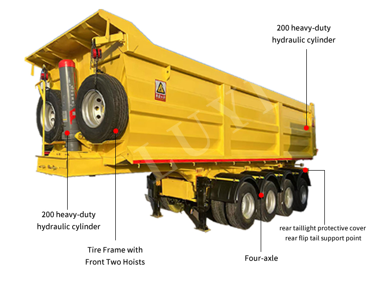 Med sitt ursprung i Shandong, Kinas högkvalitativa tillverkningsbas, är LUYI 4-axliga semitrailer för bakdumper en högeffektiv utrustning skräddarsydd för tunga transporter av bulklast. Den är konstruerad med höghållfast stål och kombinerar hållbarhet och bärande stabilitet, med en maximal nyttolast på 80 ton och anpassad till fulla arbetsförhållanden med en lastkapacitet på 60-80 ton. Den är allmänt lämplig för långdistanstransporter av bulkvaror som kol, sand och malm.