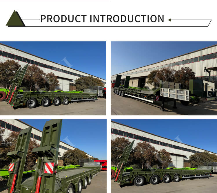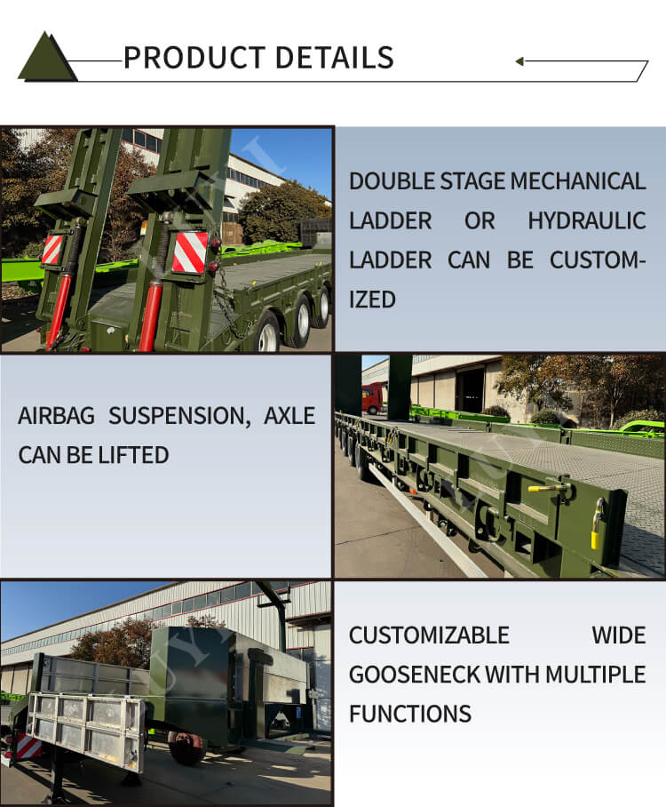 Utrustad med 4 FUWA 13-tonsaxlar och mekanisk fjädring, tillsammans med 12R22.5-däck, säkerställer släpvagnen stabil drift och stark bärförmåga. Den har standard 28-tons landningsställ och valfria 90#/50# king pins för pålitlig anslutning med traktorer. Färgen kan skräddarsys efter kundens behov, kombinerar funktionalitet och personalisering. Oavsett om det gäller transport av stora maskiner eller tung utrustning är denna släpvagn ett pålitligt val med utmärkt prestanda och solid kvalitet.