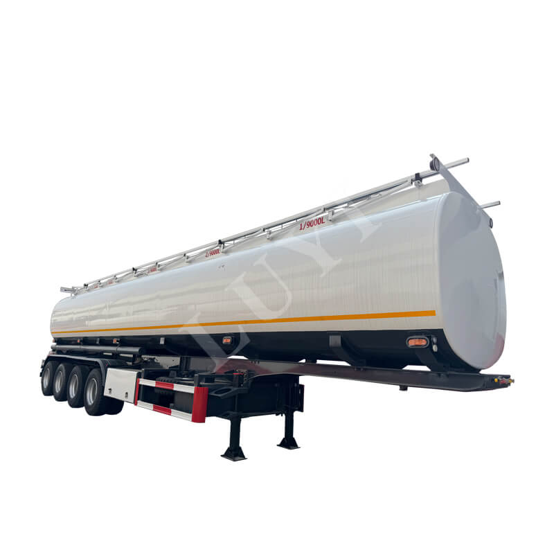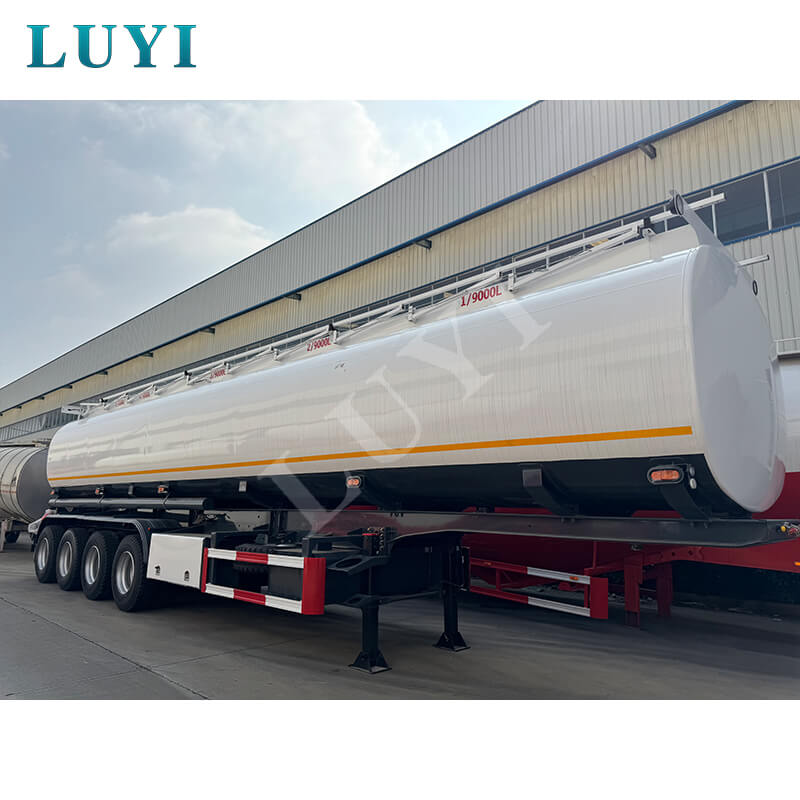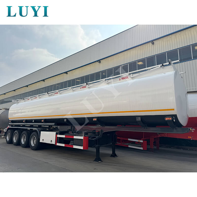 LUYI 4-axlade kolstål 5-facks 45 000 L Tanker Semi-Trailer, som kommer från Shandongprovinsen, Kina, är en högeffektiv lastbilssemitrailer speciellt utformad för bränsletransport. Den är tillverkad av kolstål och har en robust struktur. Utrustad med märkets exklusiva 4-axliga konfiguration, har den utmärkt lastbärande