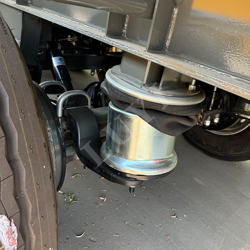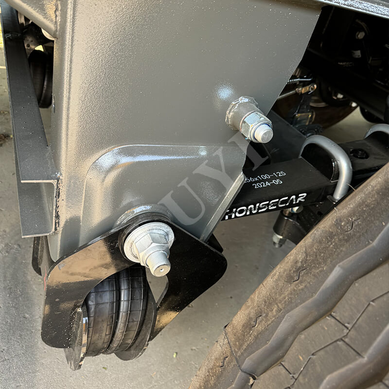 Fordonet är utrustat med 12R22.5 slanglösa däck, som har klarat flera internationella certifieringar inklusive ECE, GCC, ISO och DOT. Dessa däck är slitstarka, hållbara och minskar risken för däckexplosioner. Den erbjuder flexibla konfigurationer av 2/3/4 axlar, parade med 2-tums (50 mm) eller 3,5-tums (90 mm) JOST kingpins, anpassar sig till olika traktorer och möter olika transportscenarier. Det mekaniska fjädringssystemet säkerställer stabil körning, och designen med full airbag-rullning förbättrar avsevärt avlastningseffektiviteten och minskar arbetskostnaderna.