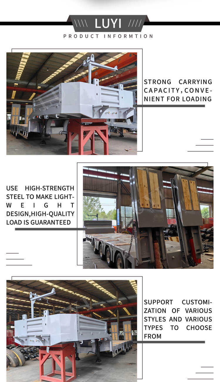 Släpvagnens dimensioner är anpassningsbara och den erbjuder 2/3/4 axelalternativ. Utrustad med ett luftfjädringssystem och 12R22.5-däck säkerställer den smidig och bekväm körning. Standardstödbenen på 28 ton ger tillförlitligt stöd, medan bromssystemet med dubbla linjer garanterar körsäkerhet. Fälgspecifikationerna är 8,0/9,0×8/12/16 stycken, och kingpin har 2-tums (50 mm) eller 3,5-tums (90 mm) JOST-alternativ för stark anpassningsförmåga. Kunderna kan välja färg, balansera praktiska egenskaper och personalisering, vilket gör det till ett idealiskt val för effektiv transport.