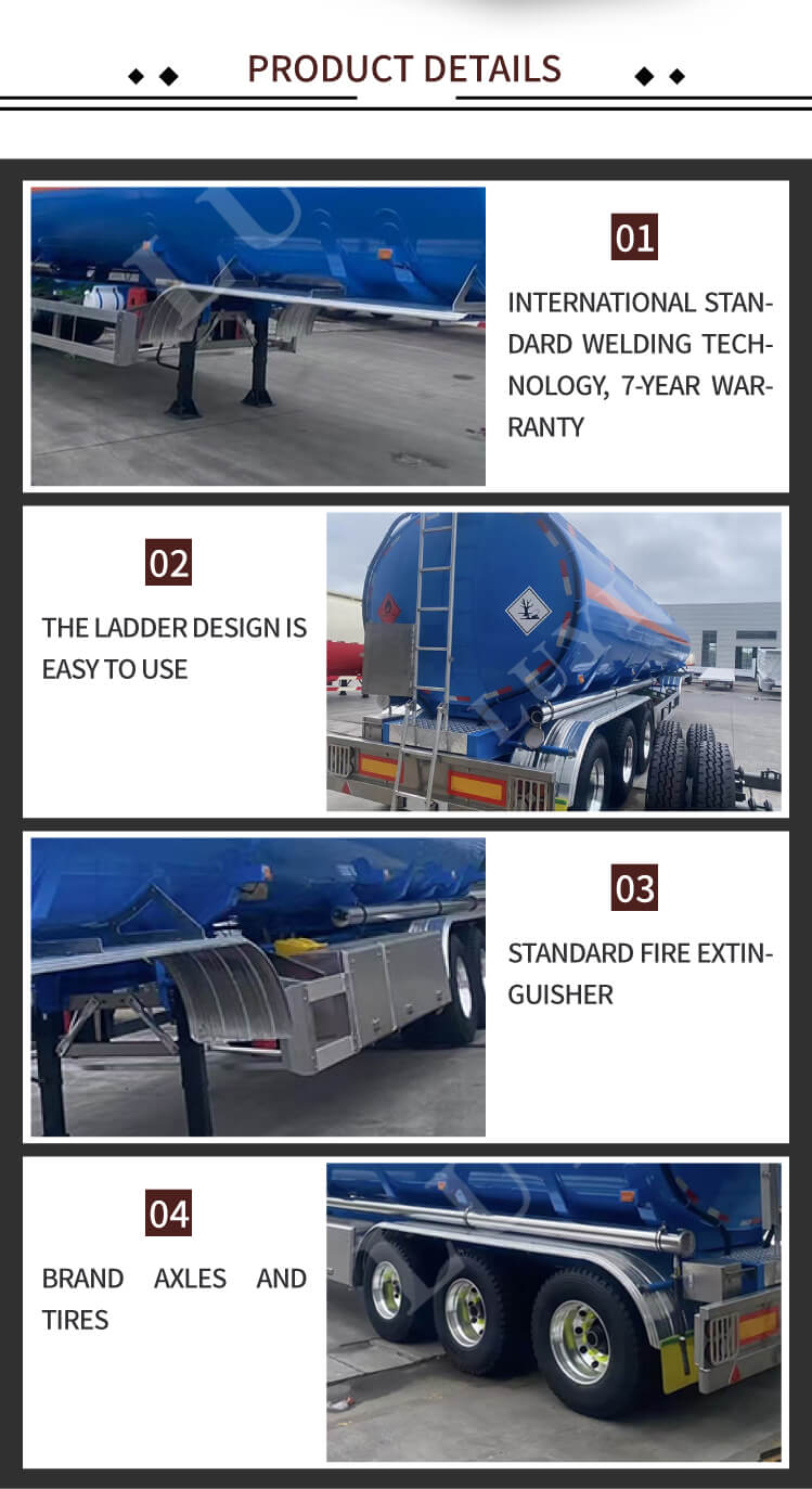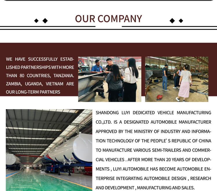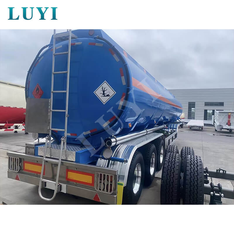 Den har flexibla konfigurationsalternativ: axlar kan väljas från LUYI, FUWA, BPW eller SAF; fjädring stöder både mekaniska och lufttyper; däck finns i 12R22.5, 12.00R20 eller 11R22.5 specifikationer. Utrustad med JOST standard 28-tons landställ och 2" (50 mm)/3,5" (90 mm) kungstift, plus 90×13×10 mm bladfjädrar, levererar släpvagnen tillförlitlig prestanda. Anpassningsbara färger möter olika varumärkesbehov, och en 6-års garanti understryker LUYI:s engagemang för kvalitet. Denna tankvagn kommer från Shandong, Kina och är idealisk för bränslelogistik och infrastrukturprojekt.