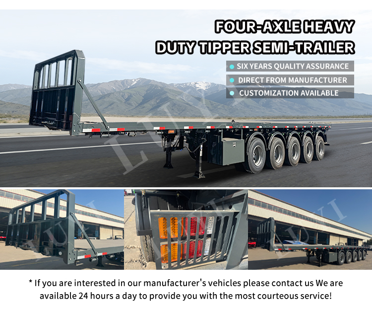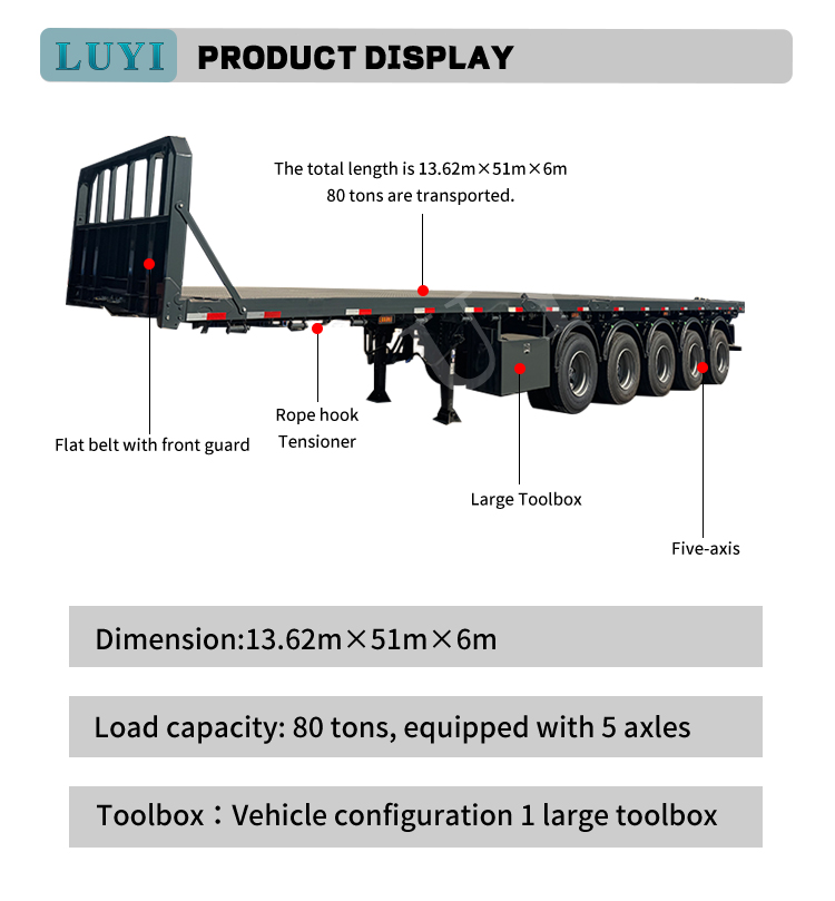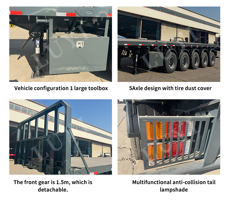 Kroppsfärg stöder personlig anpassning, justerbar enligt kundens krav för att möta användningen och visningsbehoven i olika scenarier. Med kärnfördelarna med hög lastkapacitet, stark anpassningsförmåga och stabil prestanda, framstår LUYI 5-axlade flak semitrailer som den föredragna utrustningen för effektiva operationer inom byggmaterialtransportindustrin, och hjälper användarna att minska kostnaderna, öka effektiviteten och utmärka sig i logistiktävlingen.