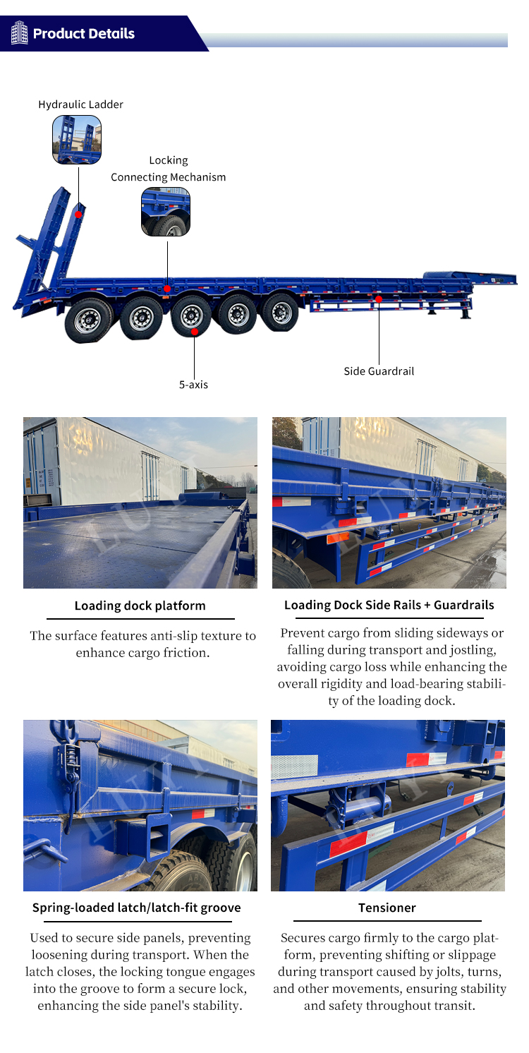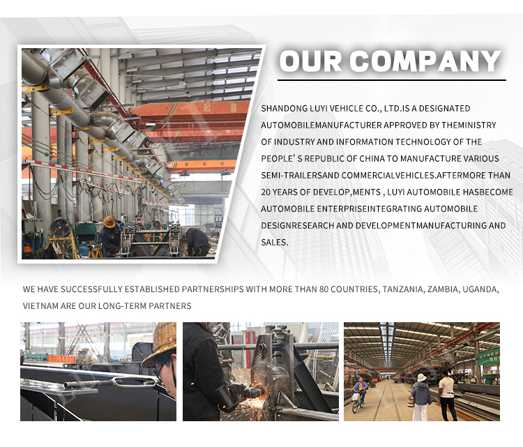 Utrustad med premiumkomponenter, har den Fuwa/BPW 13-tons axlar tillsammans med ett luftfjädringssystem, vilket säkerställer exceptionell körstabilitet och stötdämpning. Jost 28-tons tvåväxlade landningsställ möjliggör effektiva lyft- och sänkoperationer. Kunder kan välja mellan däckalternativ inklusive 315/80R22.5, 12R22.5 och 11.00R20 för att passa olika vägförhållanden. 24V LED-belysningssystemet ger stark belysning med låg energiförbrukning, och kroppsfärgen kan anpassas för att möta individuella krav. Uppbackad av Luyis pålitliga kvalitet, erbjuder denna semitrailer en pålitlig tungtransportlösning för globala kunder.