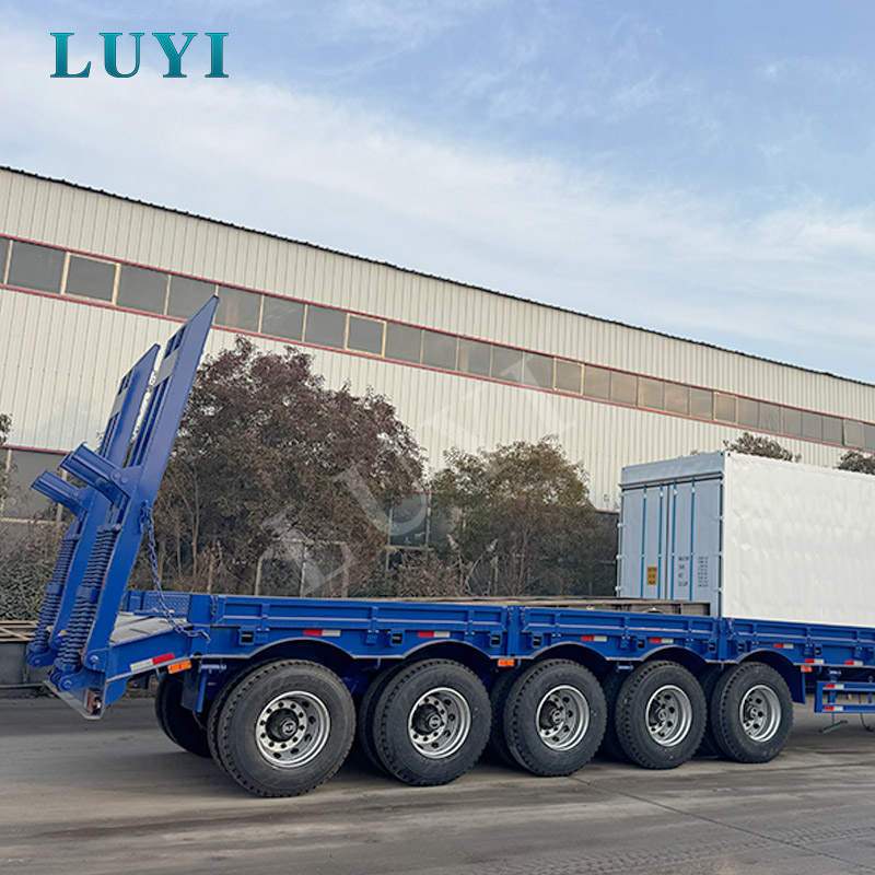 Luyi 5-axliga 80-tons tunga lågbäddspåhängsvagn kommer från Shandong, Kina, och är en robust lastbilssläp konstruerad för tung lasttransport. Den är byggd av högkvalitativt stål och har dimensioner på 130003000178 mm och en maximal lastkapacitet på 80 000 kg, perfekt för att enkelt transportera olika tung utrustning.