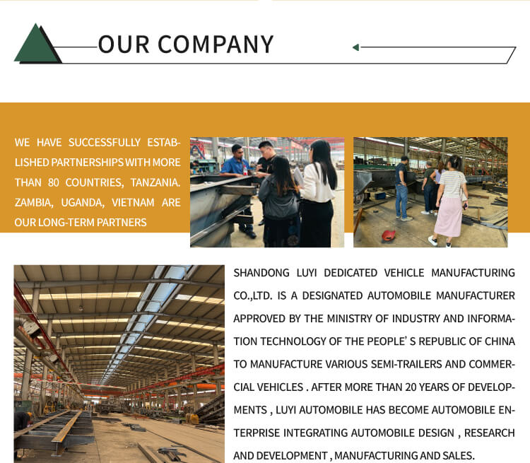 luyi semi trailer Manufacturing Co., LTD specialiserar sig på tillverkning av alla typer av semitrailers cement tankbilar oljetankbilar dumper semitrailers container semitrailers platt panel semitrailers skelett semitrailers lador semitrailers låg panel