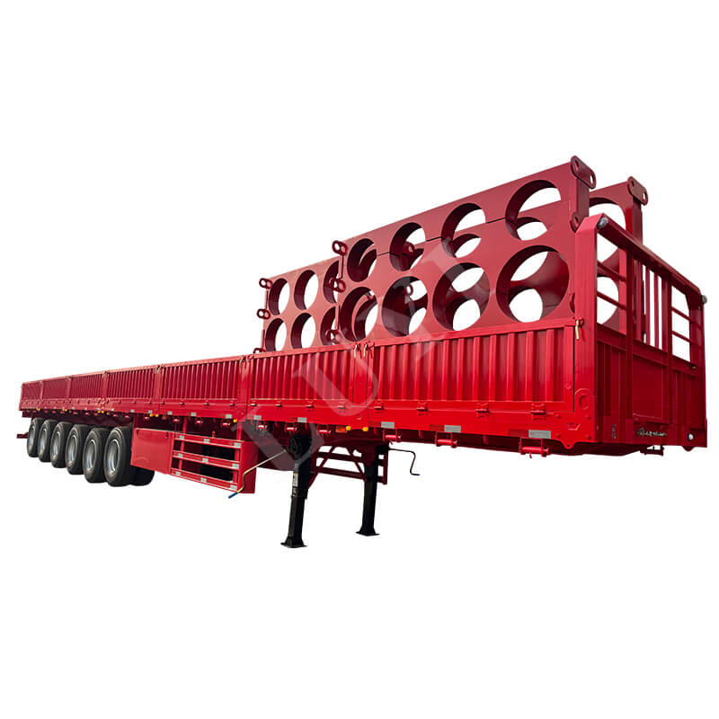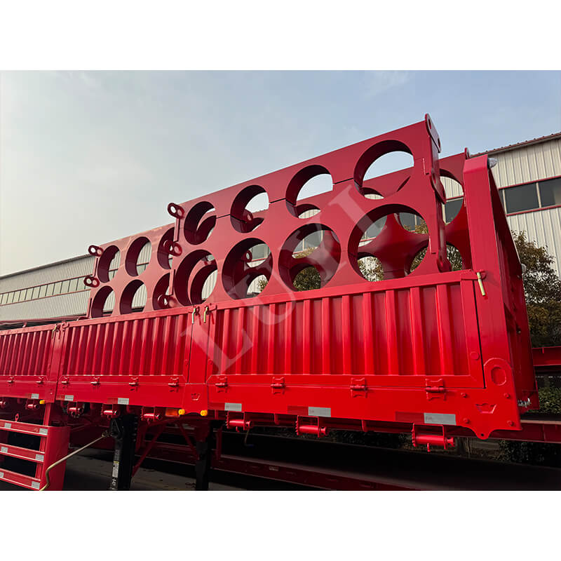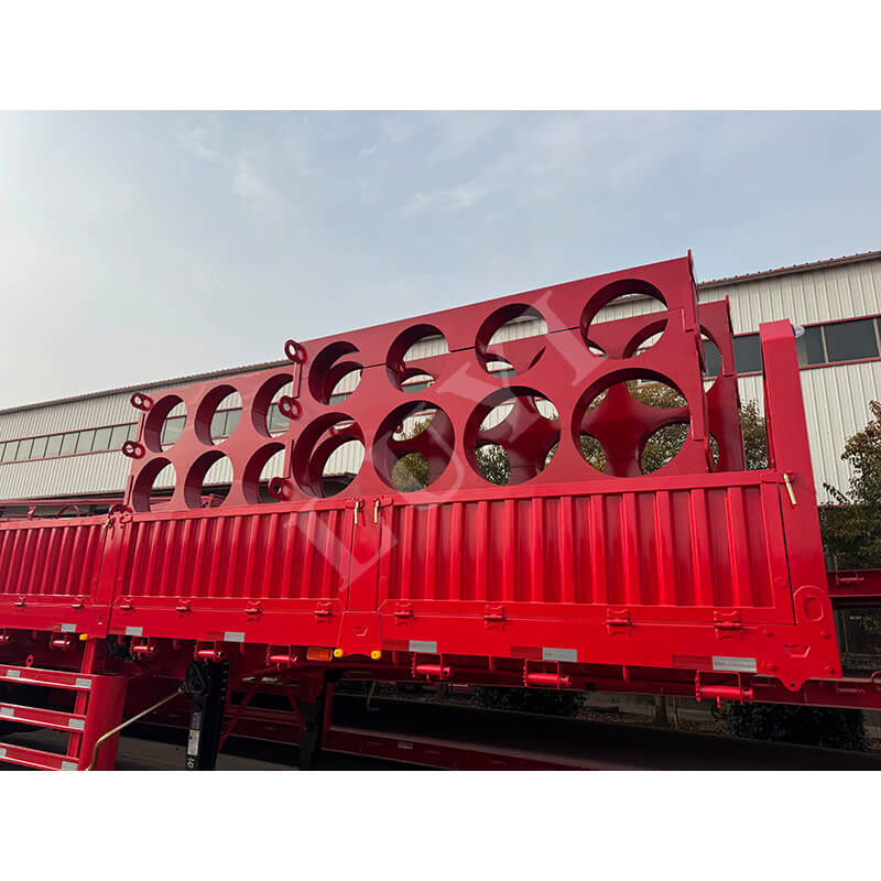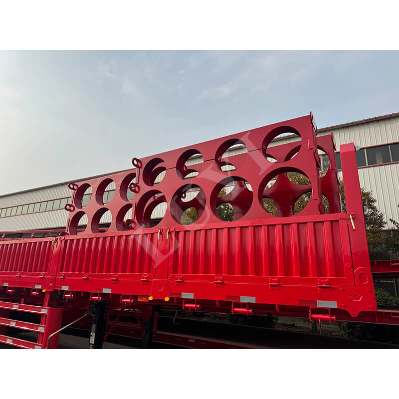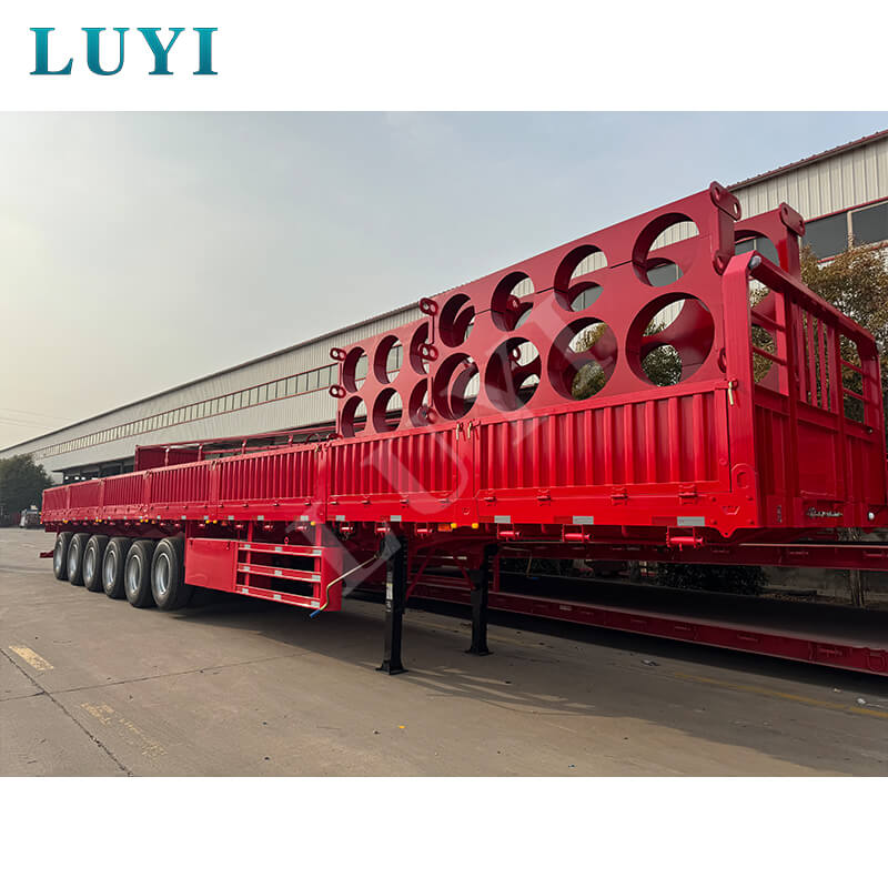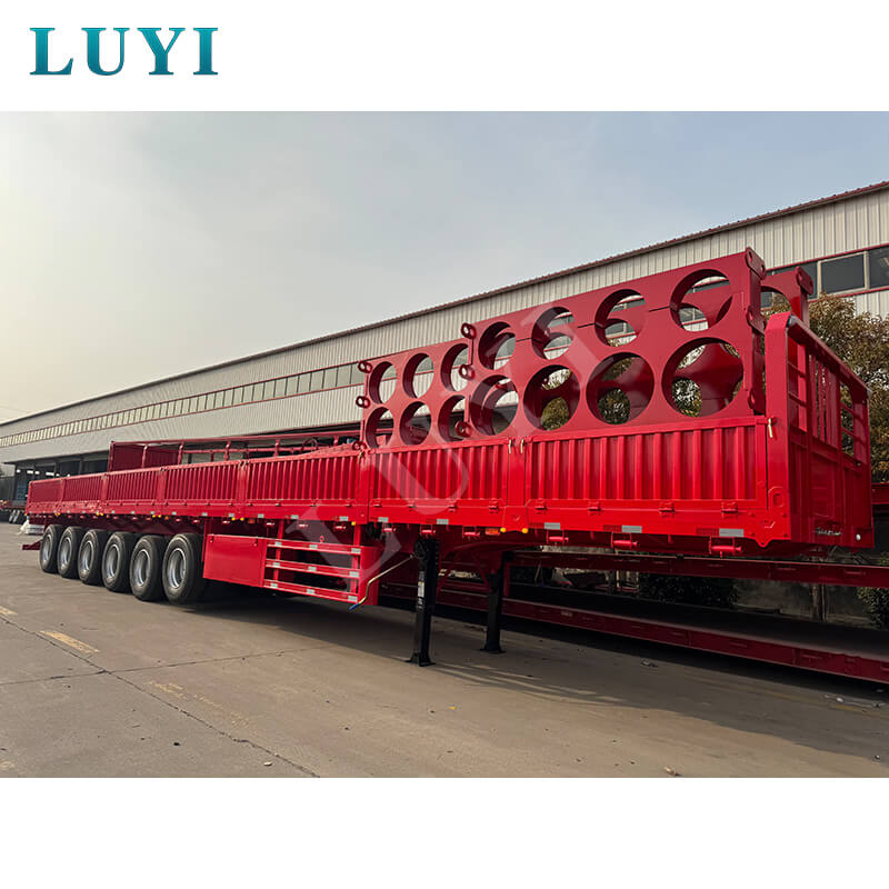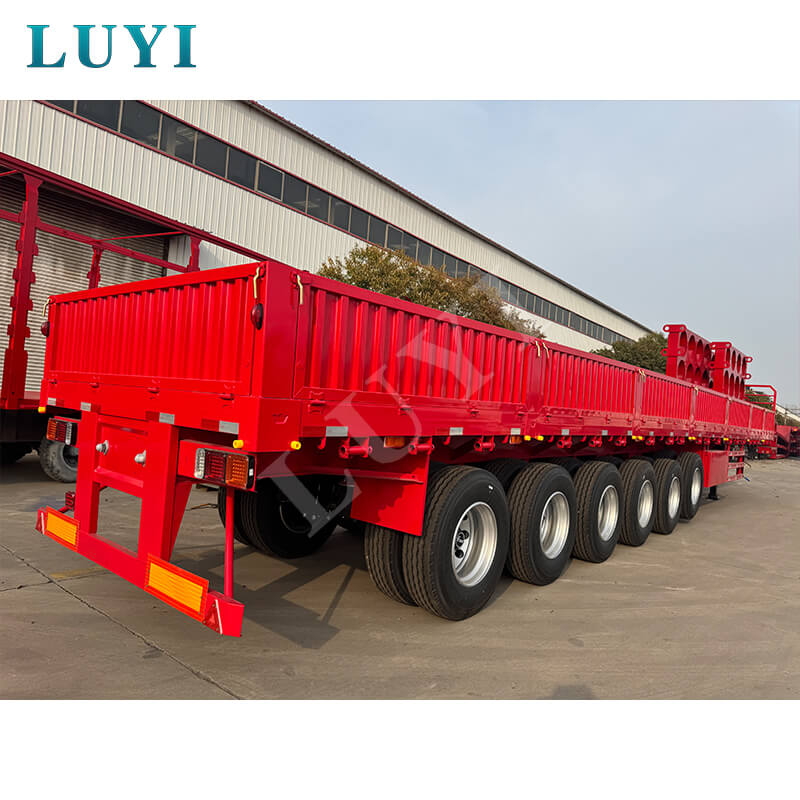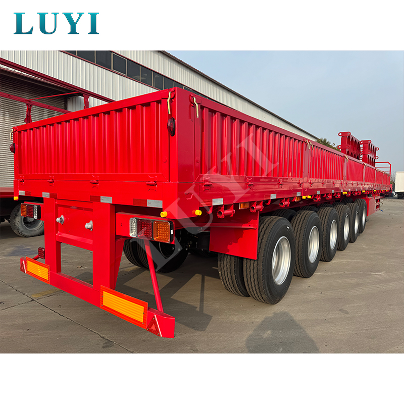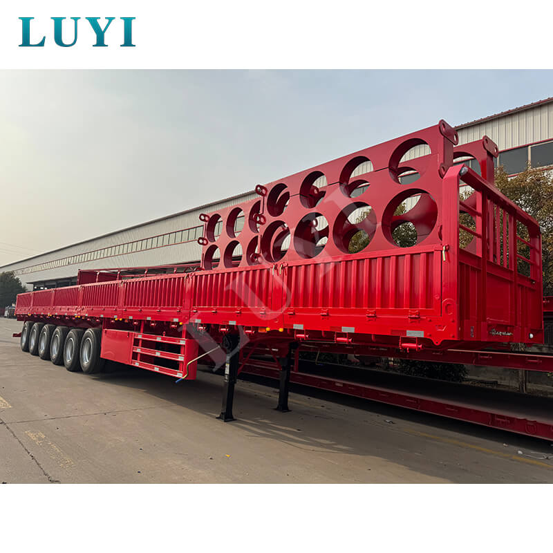LUYI 6-axlig 15,5m 80-100 Ton 40ft Side Wall Semi-Trailer, även kallad en stake-typ/flatbädds semitrailer, kommer från Shandong, Kina. Det är en högkvalitativ semitrailer designad för transport av containrar och bulklast. Den är helt tillverkad av stål och mäter 15 500 x 2 500 x 1 600 mm och har en maximal effektiv nyttolast på 60-100 ton, med stark lastbärande kapacitet för att enkelt möta behov av tung last.