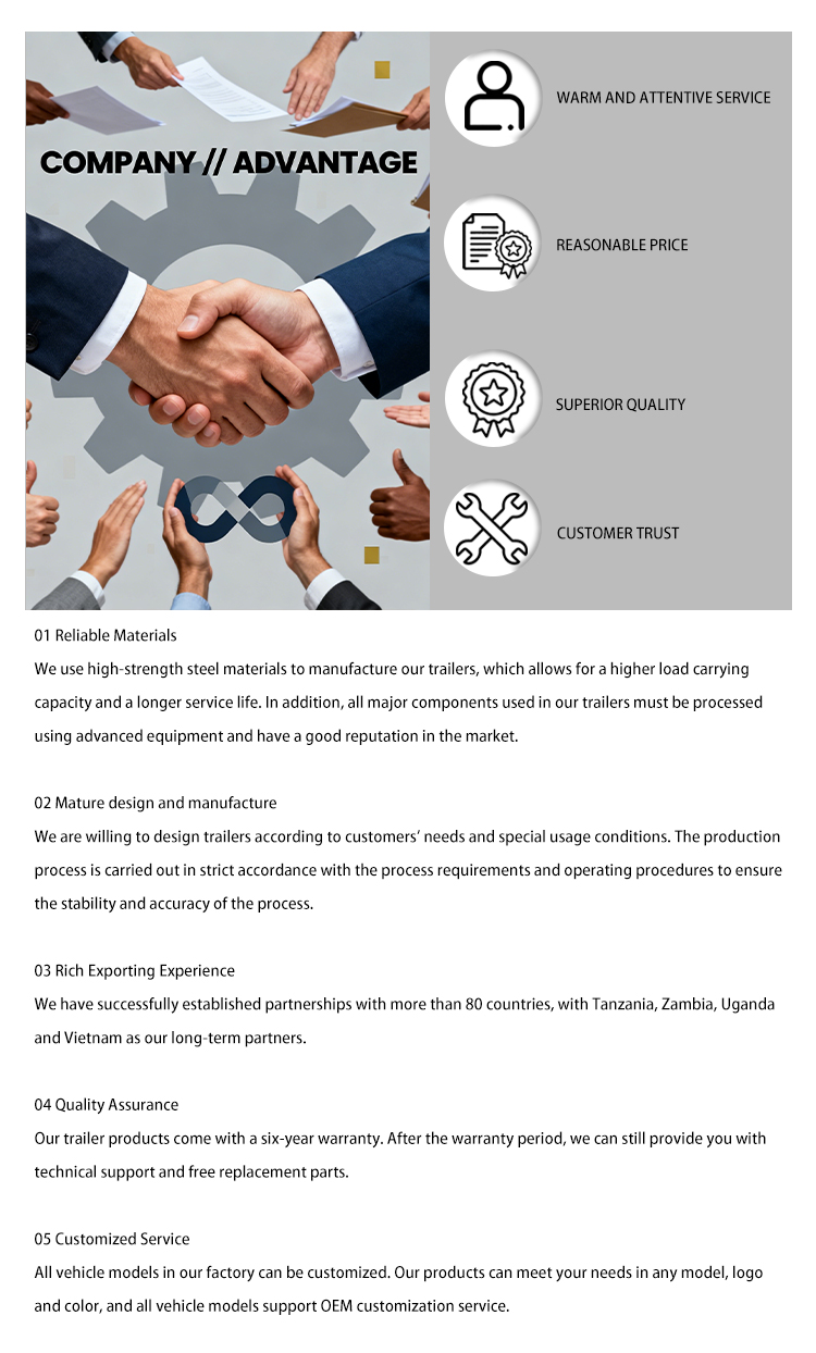 Skicka oss din förfrågan för att få en skräddarsydd offert baserad på dina faktiska transportbehov. Låt oss veta släpvagnstyp, last eller nyttolast, vägförhållanden, destination och kvantitet, så kommer vårt team att svara med en lämplig rekommendation så snabbt som möjligt.