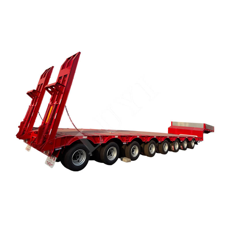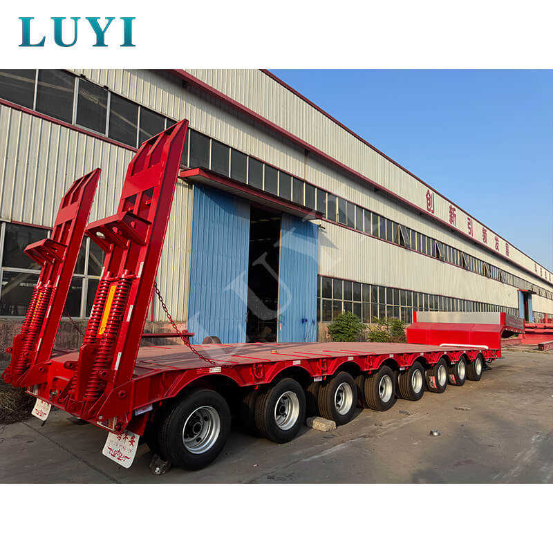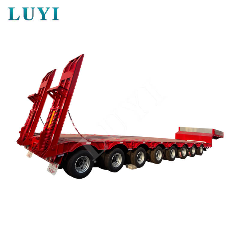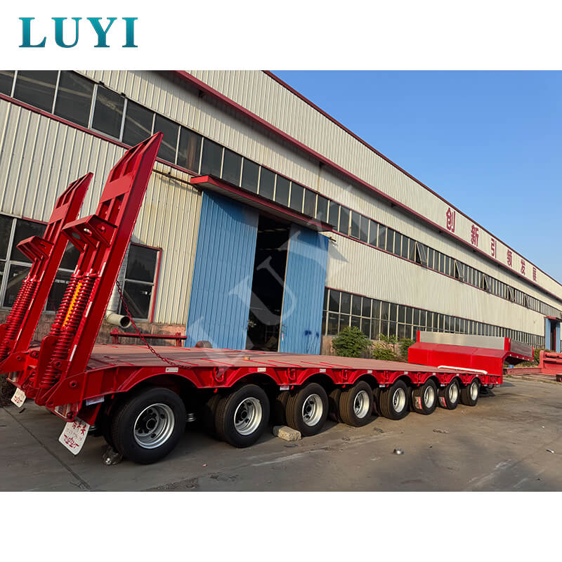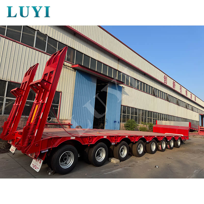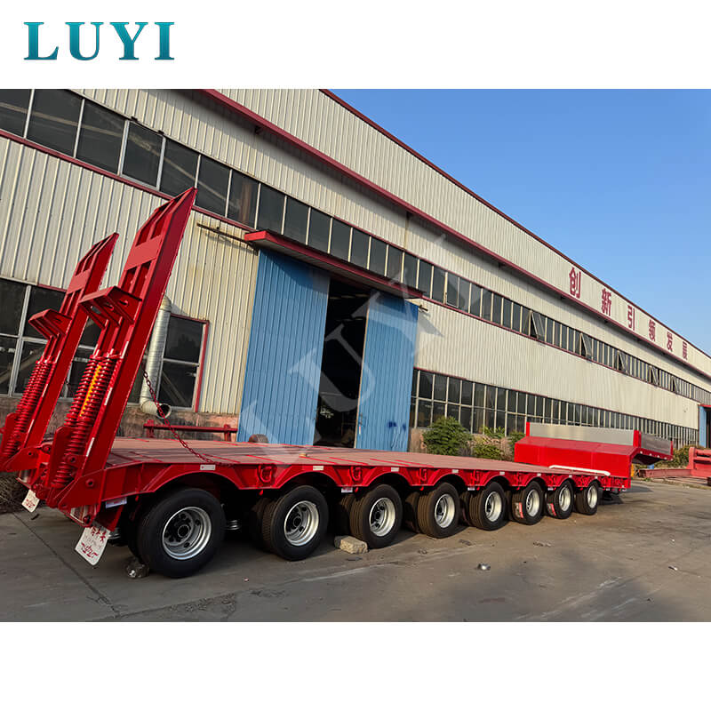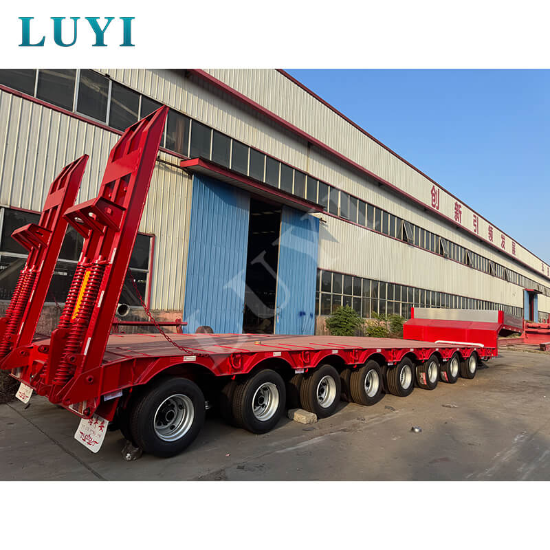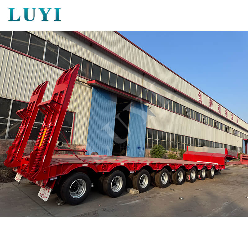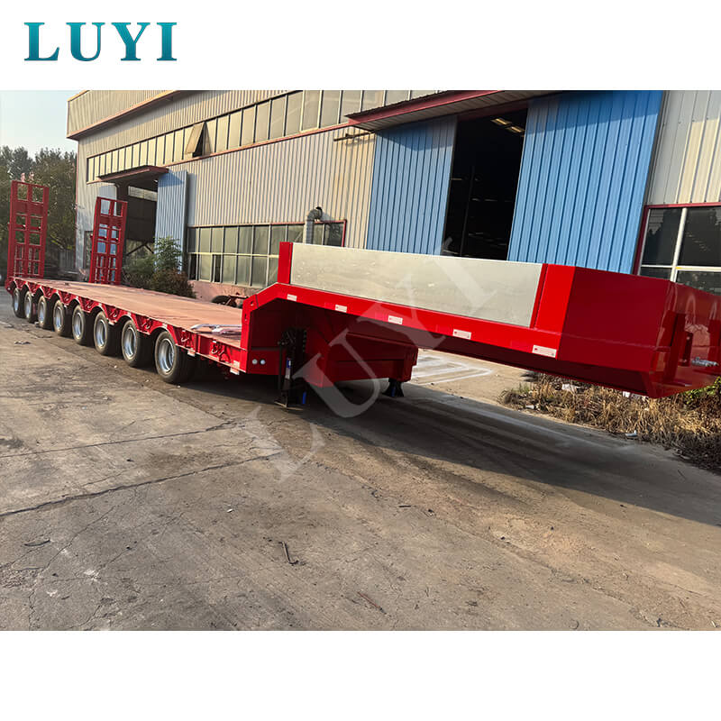 Luyi 8-axlad 150-tons 40ft lastare hydraulisk lågbäddspåhängsvagn, med ursprung från Shandongprovinsen, Kina, är en högkvalitativ påhängsvagn speciellt utformad för tung lasttransport. Tillverkad av högkvalitativt stål, kombinerar den stabilitet och hållbarhet, med en maximal effektiv nyttolast på 100 ton och en maximal lastkapacitet på 150 ton, vilket enkelt uppfyller olika tunga transportbehov.
