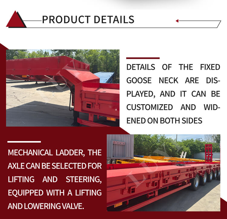 Konstruerad med högkvalitativt kolstål eller aluminium, balanserar den hållbarhet och lättviktskrav, med en maximal nyttolast på 100 ton för att enkelt hantera olika scenarier för transport av tung utrustning. Utrustad med en 8-axlig design, erbjuder den valfria Fuwa- eller BPW-axlar, parade med antingen mekanisk fjädring eller luftfjädringssystem, vilket säkerställer körstabilitet och lastsäkerhet. Tre däckspecifikationer finns tillgängliga: 12R22.5, 12.00R20 och 11R22.5, lämpliga för olika vägförhållanden.