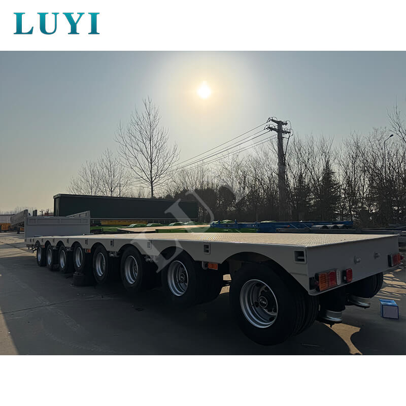 LUYI 8-axlig 17m 80-tons utdragbar luftfjädring lågbäddspåhängsvagn, en högpresterande semitrailer från Shandong, Kina, är dedikerad till transport av tung utrustning. Den använder kolstål eller aluminium som material, med en utdragbar design för att passa olika lastlängder och en maximal nyttolast på 80 ton för att möta krav på tung last.