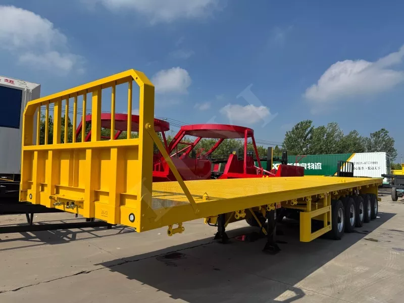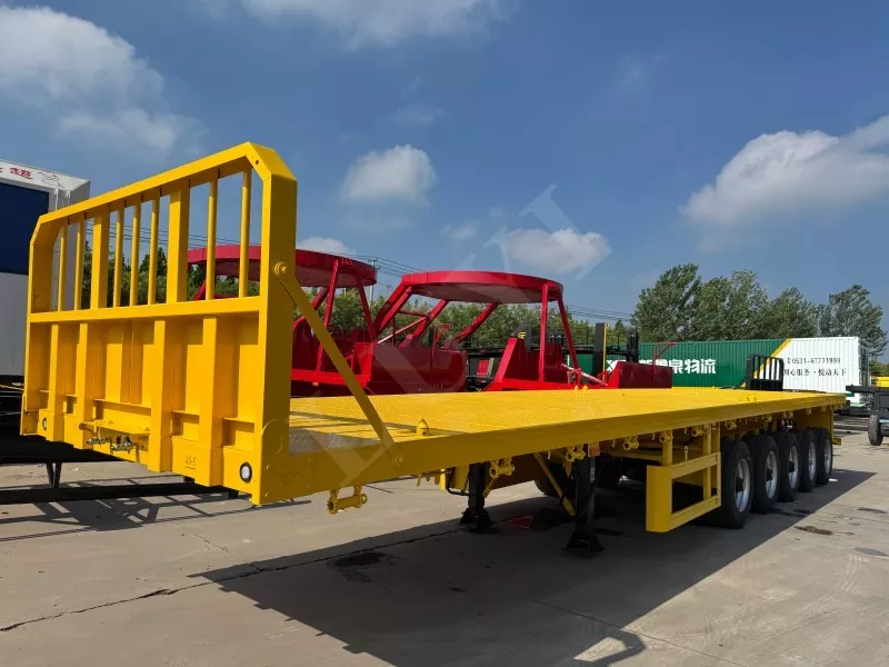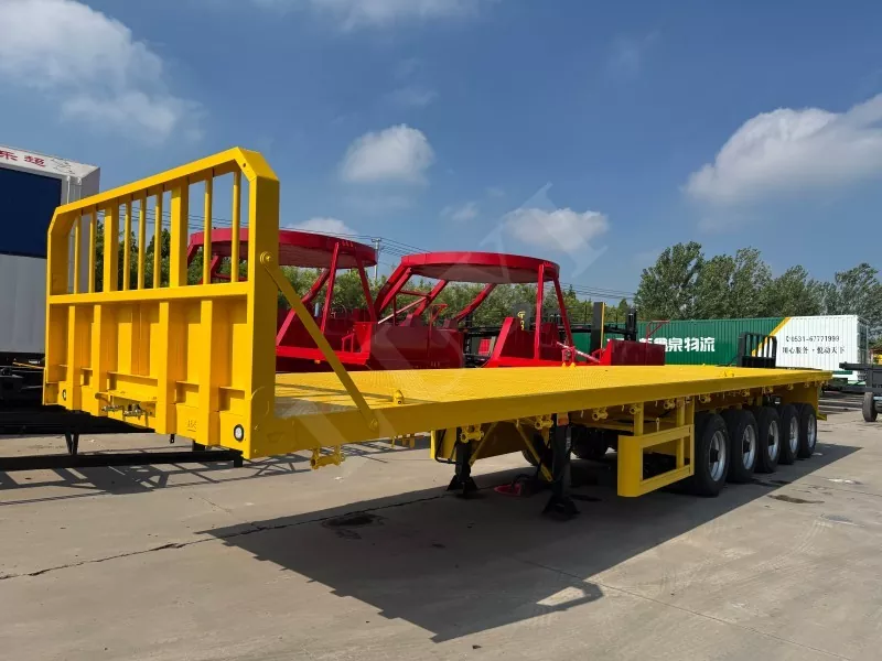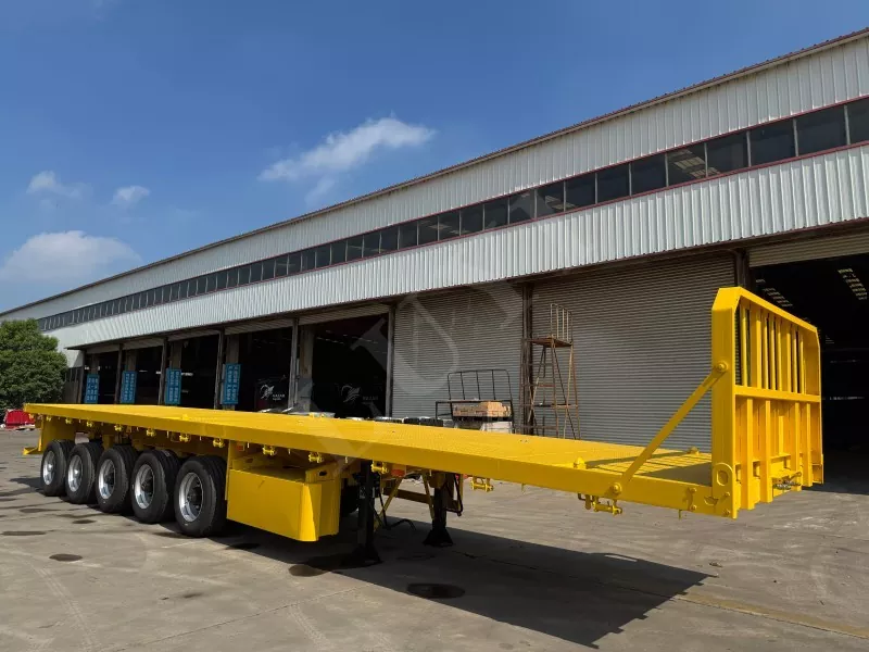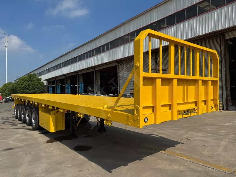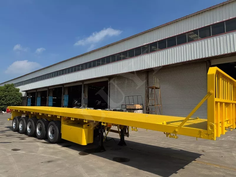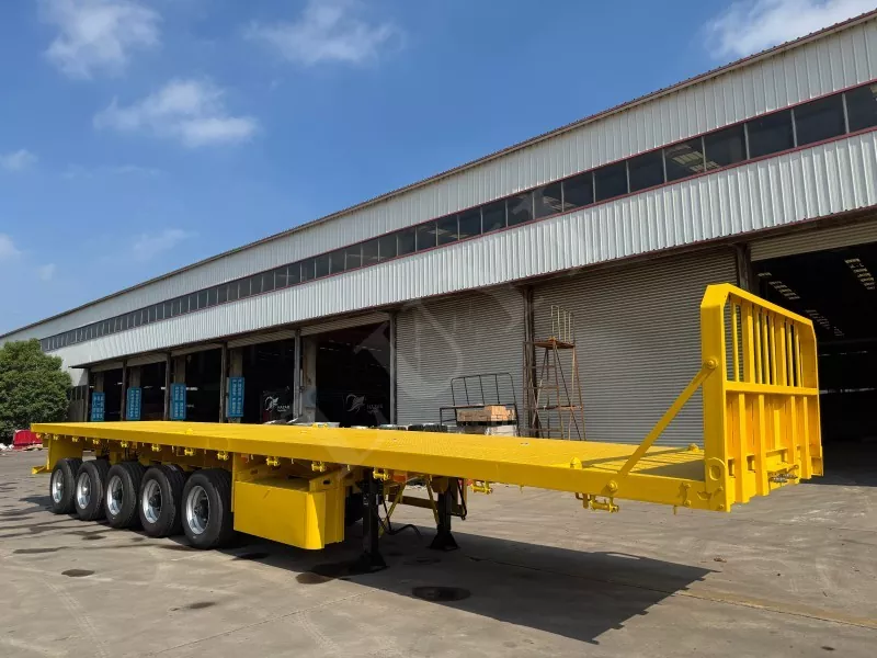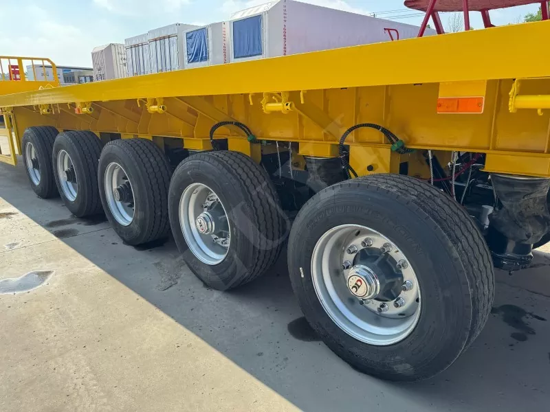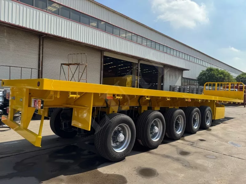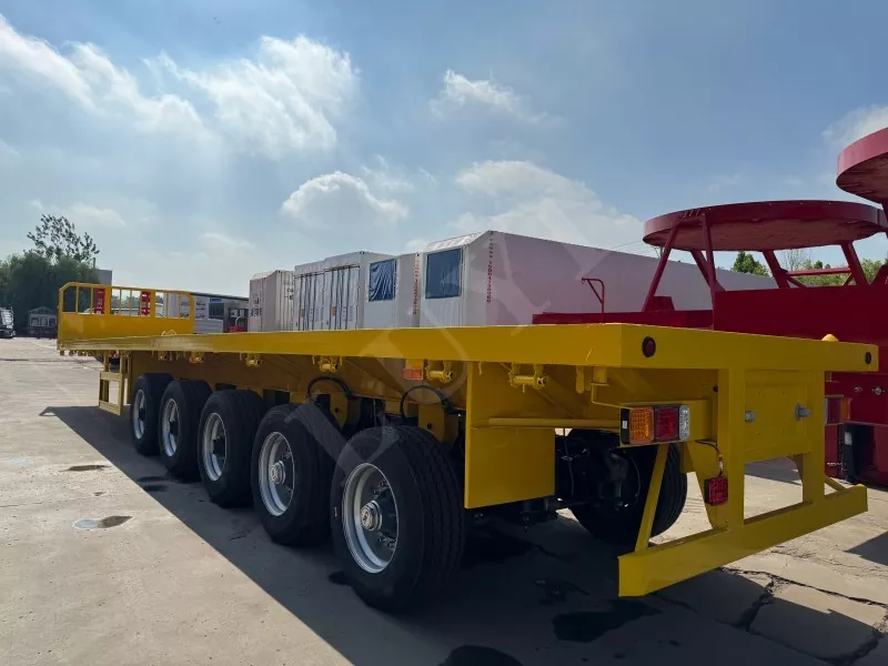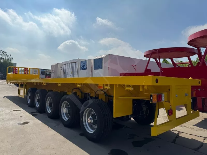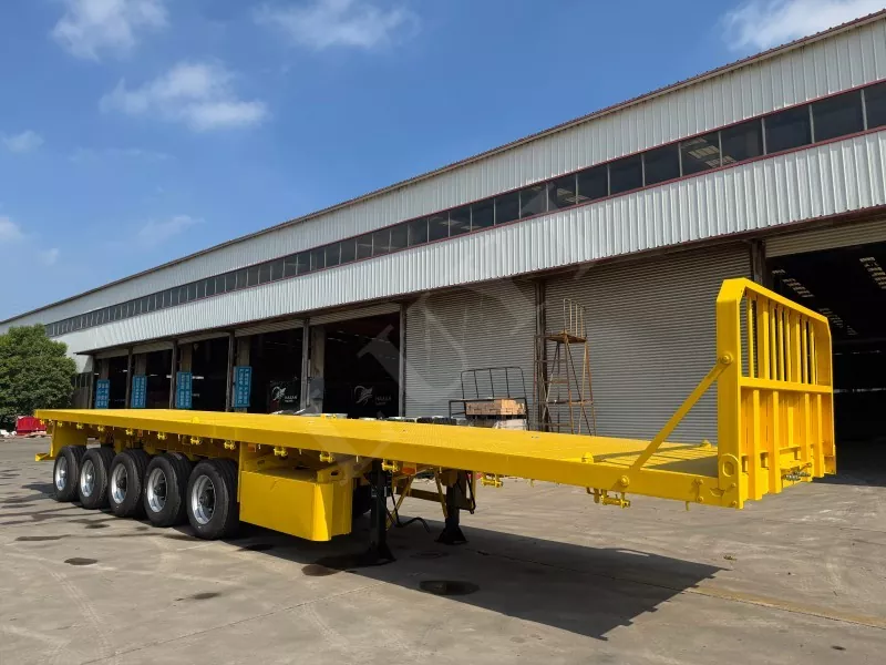 Vår containeriserade flak semitrailer är 14,5 meter lång och 2,5 meter bred, med 5-axlig flak semitrailer, CTC uppföljande styrfunktion på de bakre 2 axlarna, kan transportera 100 ton, och utrustad med 12 containerlås.