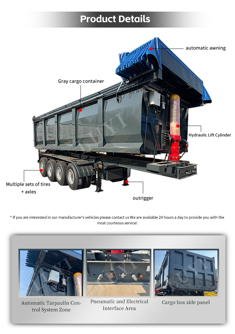 Konstruerad med Q345 hjulnav av kolstål på 500 mm höjd och förstärkta huvudbalkar med 70 tons bärighet, säkerställer den stark strukturell stabilitet och lång livslängd. Konfigurerad med 4/6 axlar som tillval, matchande mekaniska fjäder- eller luftfjädringssystem och däck med flera specifikationer inklusive 11.00R20, 12R20 och 315/80R22.5, kör den stadigt på olika komplexa vägförhållanden. Den hydrauliska cylinderdrivna U-formade tippkroppen möjliggör snabb och effektiv lossning. Anpassningsbar färg är tillgänglig för att möta olika kundkrav, vilket gör den till en pålitlig och hållbar tung transportutrustning för bulkmaterial som sand, grus och kol.