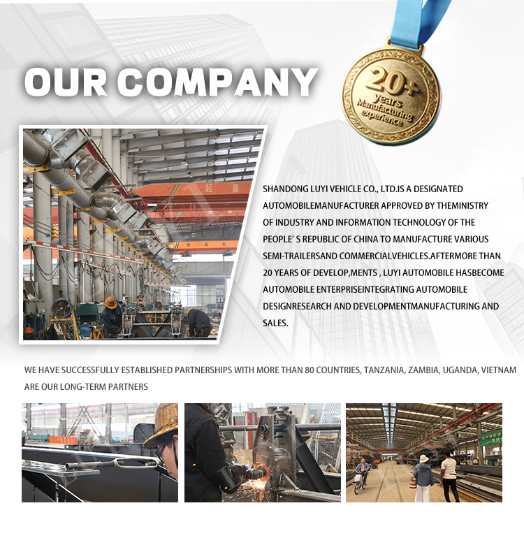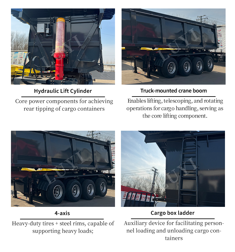Denna LUYI semitrailer med bakre tippvagn är en semitrailer för tunga transporter som kommer från Shandong, Kina, speciellt designad för bogsering av tunga lastbilar inom gruvdrift, infrastruktur och bulklasttransporter. Tillverkad av högkvalitativt massivt stål, har släpvagnen utmärkta lastbärande prestanda med en maximal lastkapacitet på 70 ton och en tjänstevikt på endast 9 ton, vilket uppnår en optimal balans mellan tung last och lätt kaross. Dess övergripande mått är 9000mm×2550mm×3700mm, med justerbar sidovägghöjd som sträcker sig från 400mm till 1200mm för flexibelt lastutrymme.