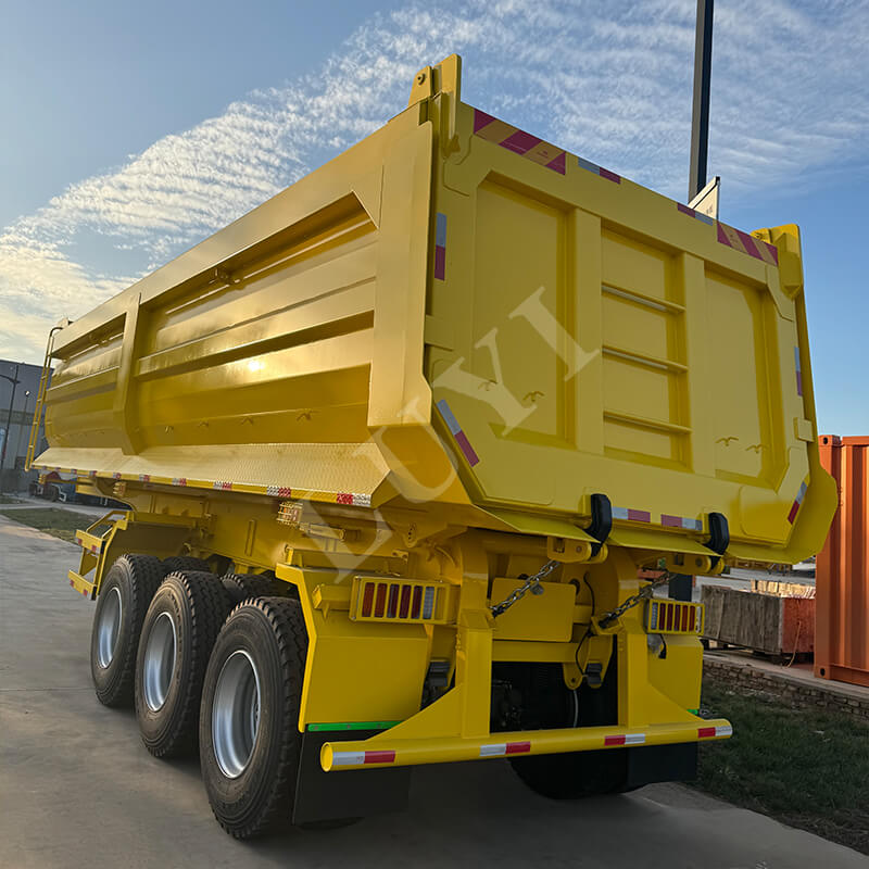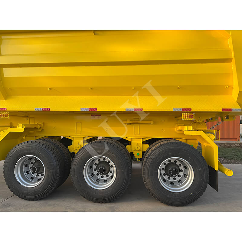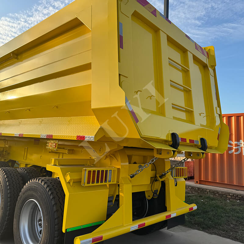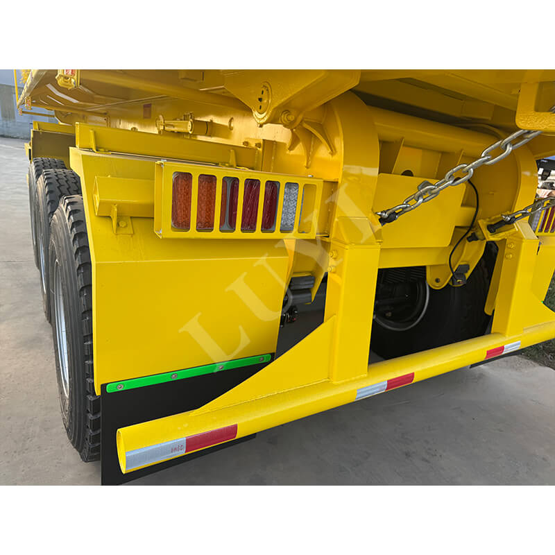 Fordonet har utmärkt flexibilitet. Axlarna kan konfigureras med 2/3/4 axlar, utrustade med Fuwa eller BPW axlar. Fjädringen kan vara valfri mekanisk eller luftfjädring, anpassad till olika vägförhållanden; den matchas med 12R22.5/12.00R20/11R22.5规格 däck för stabil körning. Den är utrustad med standardstödben på 28 ton för att garantera parkeringssäkerhet. Kingpin ger 2-tum (50 mm) eller 3,5-tum (90 mm) JOST-alternativ. Färgen kan anpassas efter kundens behov. Den hydrauliska tippkonstruktionen är effektiv och bekväm, vilket ger en högkvalitativ lösning för materialtransport.