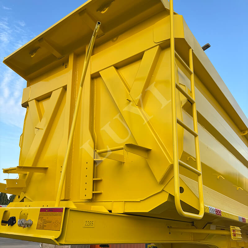 LUYI tunga hydrauliska 3-axliga U-typ baktippande semitrailer, med ursprung från Shandongprovinsen, Kina, är en dumpersläp som är speciellt utformad för material som sand, grus och spannmål. Materialet kan väljas från kolstål eller aluminiumlegering, vilket balanserar behoven av styrka och lättvikt. Karossstorleken är 12500×2500×3600 mm, och den maximala effektiva lasten når 60 ton, vilket uppfyller kraven för tunga transporter.