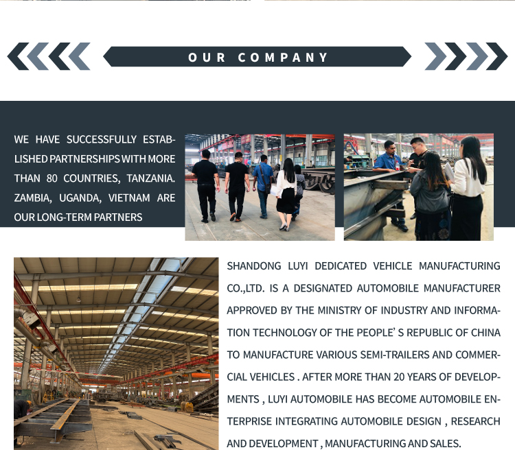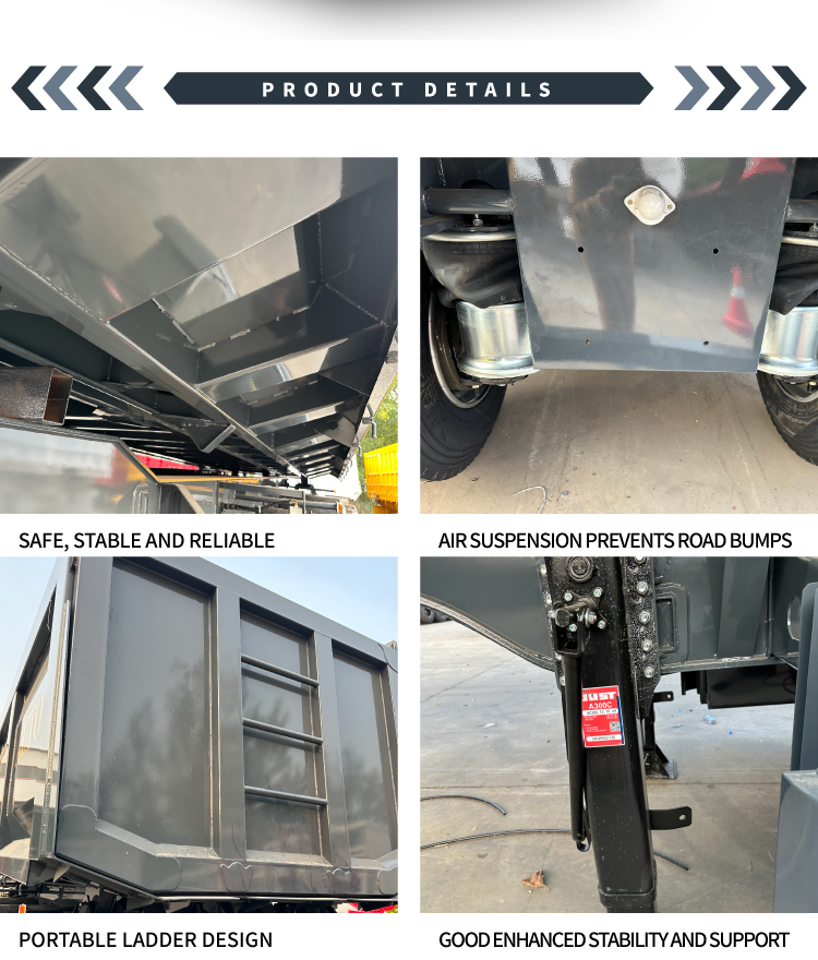 Med hjälp av ett hydrauliskt lyftsystem kan lastlådan uppnå 45–60° tippning bakåt för lossning. Den stjärtöppnande designen gör operationen enkel och effektiv med kort lossningstid. Utrustad med luftbromsar, mekanisk/bladfjädrad fjädring och ett standarddragstift är den kompatibel med de flesta tunga traktorer och har låga underhållskostnader. Den svarta beläggningen är smutsavvisande och lätt att underhålla. Oavsett om det är för korta avståndstransporter av material som kol, malm och grus, eller kompatibla långväga vägtransporter, är det en pålitlig och effektiv transportpartner.