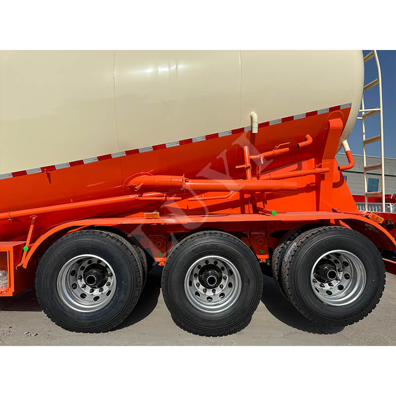 Släpvagnens mått är 10500×2550×4000 mm. Den är utrustad med två alternativ för mekanisk/luftfjädring, tillsammans med en 3-axlig stabil struktur och 28-tons kraftiga stödben för att säkerställa stabilitet under parkering och körning. Det dubbla bromssystemet ökar säkerheten. Däckalternativen inkluderar olika specifikationer som 11.00r20 och 12r22.5, och kingpin finns i två modeller: JOST 50 mm / 90 mm. Dessutom kan färgen anpassas efter behov, helt anpassad till olika transportscenarier och estetiska krav, vilket gör den till en pålitlig utrustning för bulkcementtransport.
