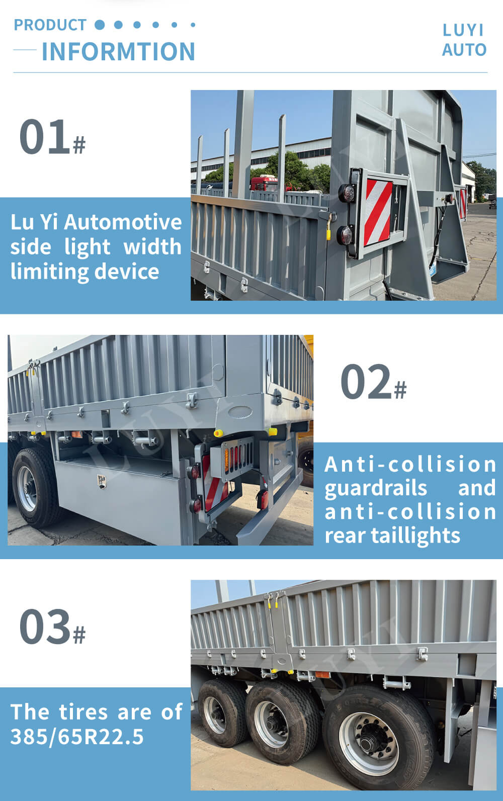 Den 3-axliga sidoväggssemitrailern med pelare från LUYI, ett varumärke baserat i Shandong, Kina, är ett optimalt val för bulklast och containertransporter. Den är tillverkad av högkvalitativt stål och har exakta mått på 12500x2500x1600mm och en maximal nyttolastkapacitet på 60 ton, vars kraftfulla bärighet lätt kan möta olika tunga transportbehov.
