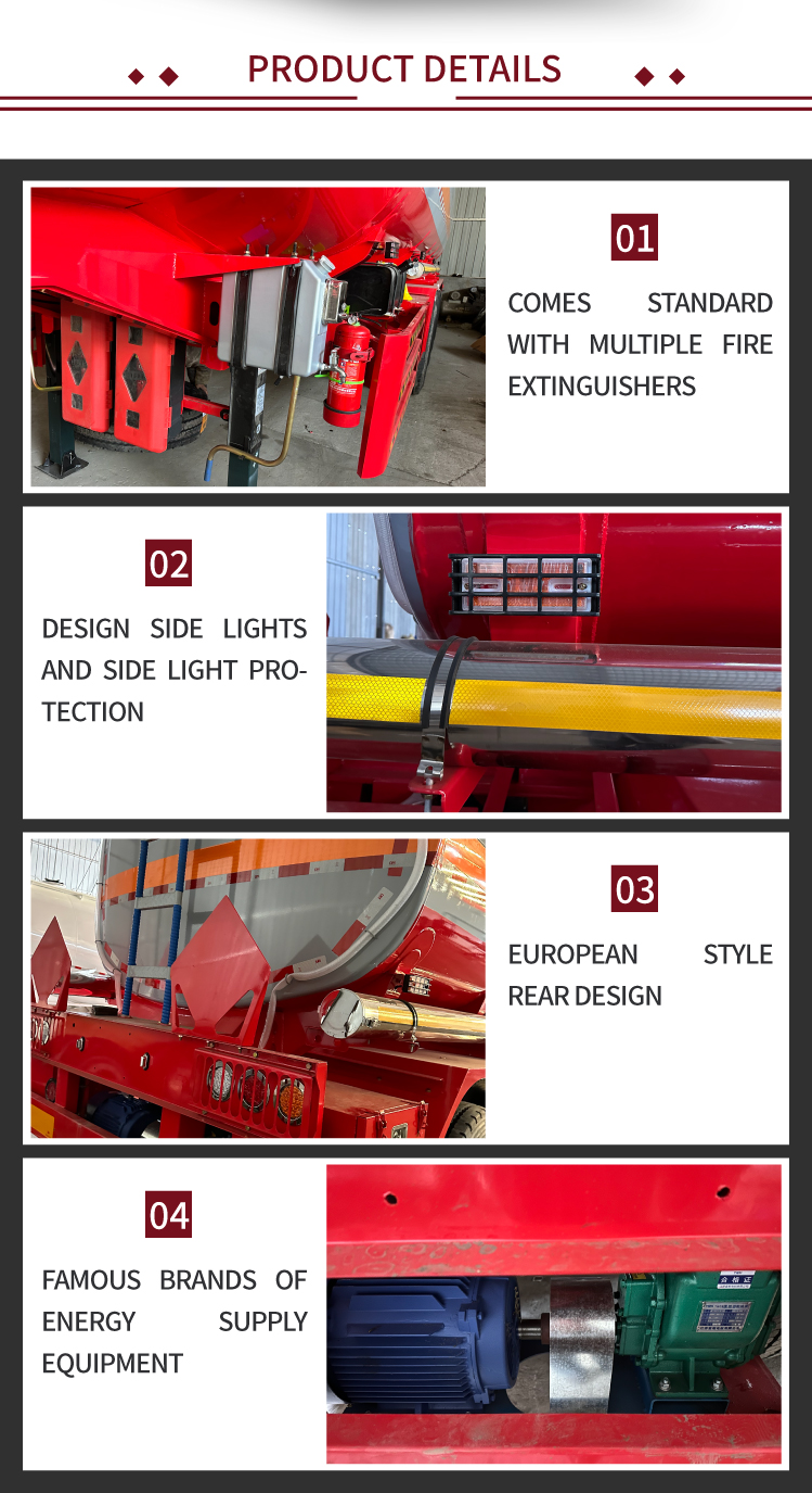 Den 30-45 kubikmeter anpassningsbara semitrailern för oljetankar är ett specialiserat transportfordon designat för flytande oljor som diesel, bensin och smörjmedel. Med en motsvarande lastkapacitet på 21-31,5 ton (baserat på dieseldensitet på 0,7 ton/kubikmeter), passar den vanliga logistikscenarier - från påfyllning av bensinstationer i stads- och mellanstadsområden och industriell oljedistribution till långdistanstransport av stamledningar via flottans 组队, vilket eliminerar ineffektivitetsmodeller för små kapaciteter och ineffektivitet.