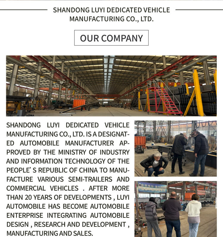 Släpvagnen är utrustad med 4 axlar från kända märken BPW eller FUWA, parat med 12R22.5 däck för stabil körning och stark bärighet. Den erbjuder två fjädringsalternativ – mekanisk och luftfjädring – för att anpassa sig till olika vägförhållanden och minska lastvibrationer. Detaljer som 28T standardlandningsställ och 2-tums (50 mm)/3,5-tums (90 mm) JOST kungstift förbättrar användbarheten. Med en polyuretanmålningsprocess för rostbeständighet, anpassningsbara färger och en 6-års garanti säkerställer den hållbarhet och bekymmersfri användning.