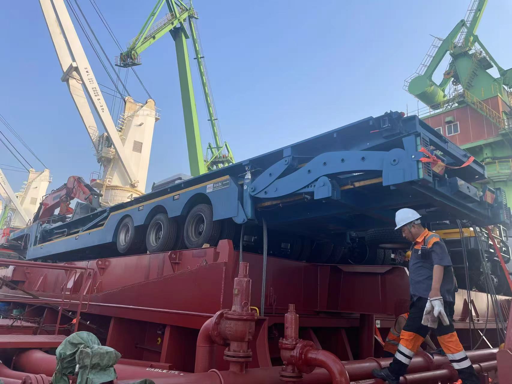 I början av hösten var en internationell hamn i Shandongprovinsen full av aktivitet. Dussintals Luyi3 axlade 4 fots flak semitrailersparkerades på ett ordnat sätt vid terminalen. Efter att ha gått igenom flera procedurer, såsom tullinspektion och säkerhetsförstärkning, lyftes semitrailrarna långsamt in i lastrummet på ett oceangående fraktfartyg med professionell lyftutrustning. Denna lastningsoperation markerade den officiella lanseringen av det gränsöverskridande transportsamarbetet mellan varumärket Luyi och kazakiska kunder. Luyi 3-axliga 4-fots flak semitrailers kommer att korsa nationella gränser för att tillhandahålla tunga lastlösningar för ingenjörstransportsektorn i Kazakstan.