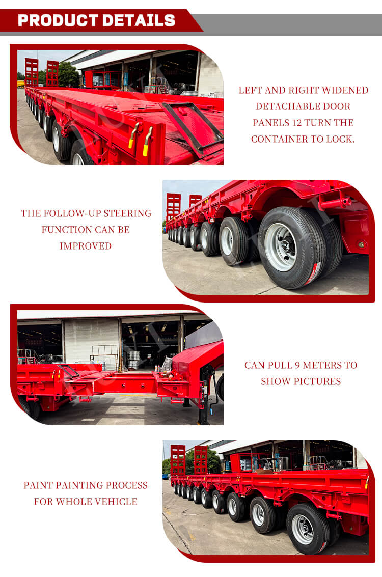 Utrustad med en 10-axlig förstärkt design och tillsammans med luft- eller bladfjädring, levererar släpet enastående körstabilitet. Den fasta svanhalsstrukturen säkerställer tillförlitlig dragkraft, medan den hydrauliska eller manuella stegen underlättar lastning och lossning. Den levereras som standard med 28-tons landställ för stabilt och hållbart stöd, och färgen kan anpassas efter behov. Med sin utmärkta strukturella design och strikta kvalitetskontroll är den lämplig för transport av tung last som stor utrustning och tekniska komponenter, vilket ger en effektiv och säker lösning för logistik- och transportbranschen.