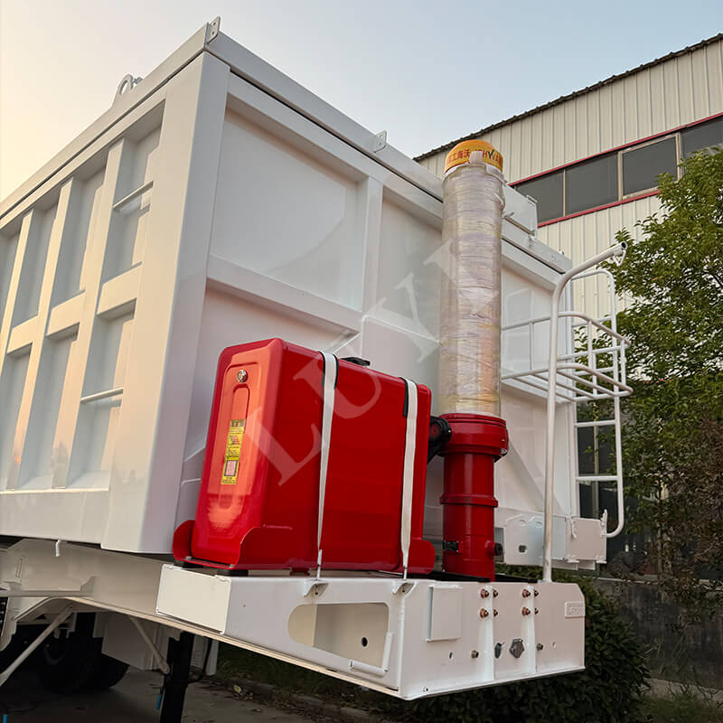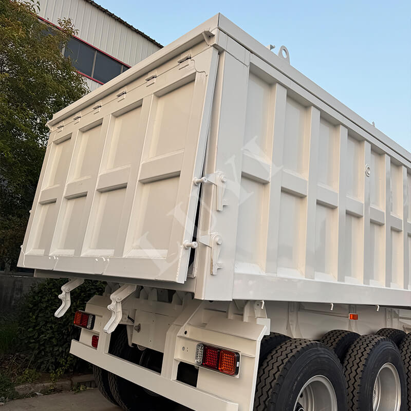 Kroppen är gjord av högkvalitativt kolstål, med en robust och hållbar struktur. Storleken och färgen kan anpassas efter kundens behov för att anpassa sig till olika transportscenarier. Fordonet är utrustat med standardstödben på 28 ton, vilket ger stark stödkraft. Dragstiftet kan väljas i 2-tums (50 mm) eller 3,5-tums (90 mm) specifikationer, kompatibelt med olika traktormodeller. Som en professionell bakdumpande semitrailer kan den effektivt slutföra självlossningen av tunga föremål och är ett utmärkt val inom tunga lasttransporter.