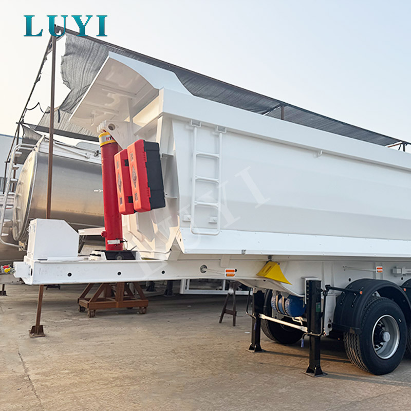 Den LUYI treaxlade U-formade hydrauliskt justerbara semitrailer med baktipp är en effektiv transportutrustning speciellt utformad för transport av material som sand, grus och spannmål. Det kommer från högkvalitativ tillverkning i Shandong, Kina.